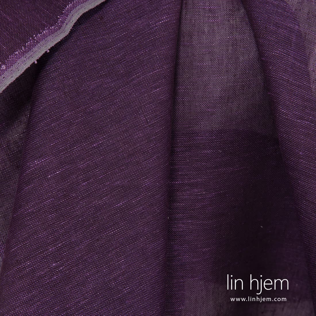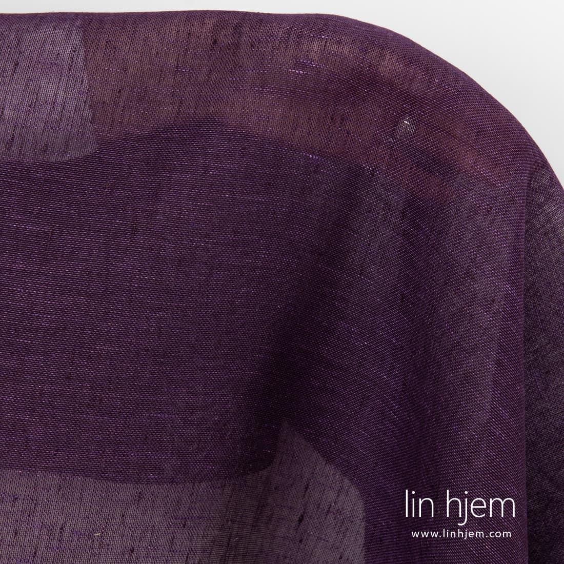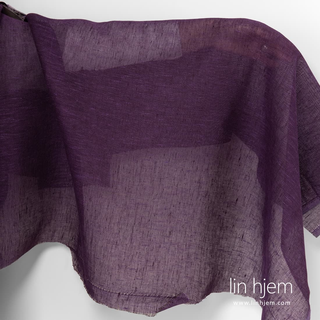 Gjennomsiktig lilla linstoff vevd av intens lilla og mørkelilla garn. Lett, løstvevd derfor passer best til å sy gardiner, skjerf.