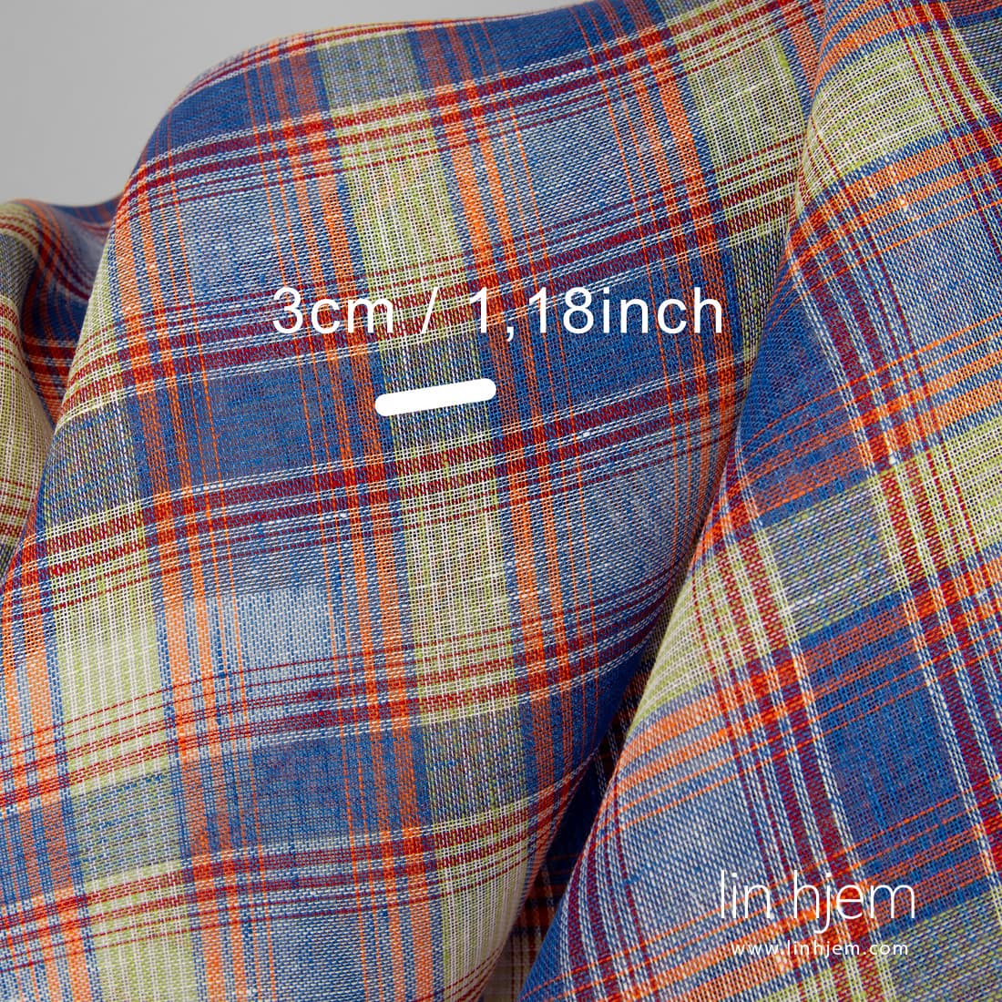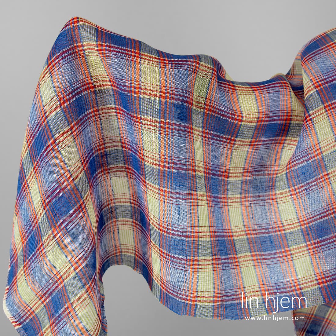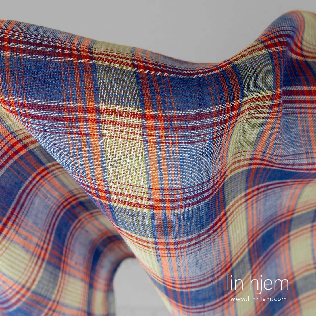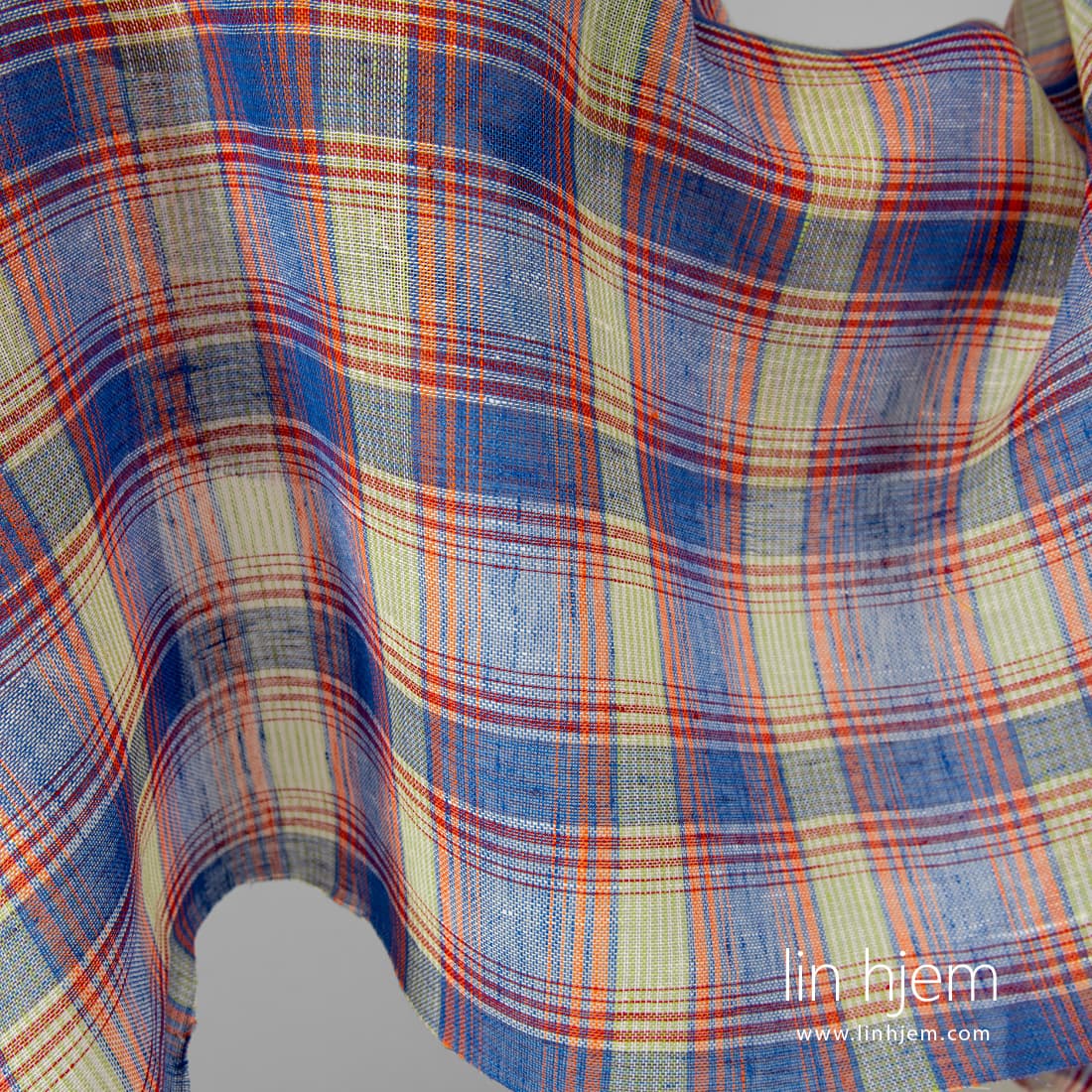 Gjennomsiktig linstoff i blå og oransje ruter vevd av blå, oransje, melkehvite, lyserøde, blå-lilla lingarn. Lett, løstvevd stoff som passer til å sy gardiner, skjerf.