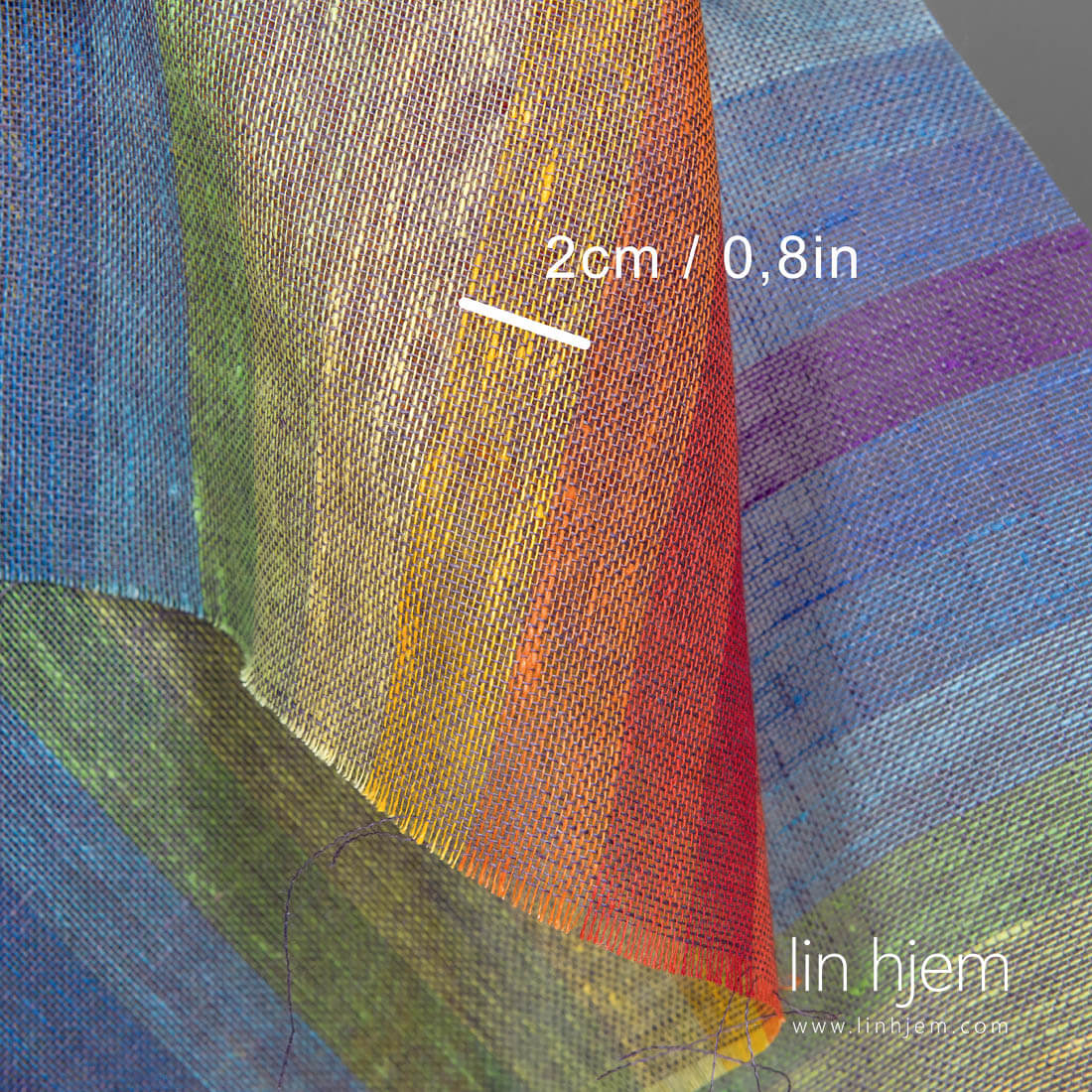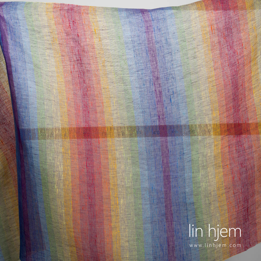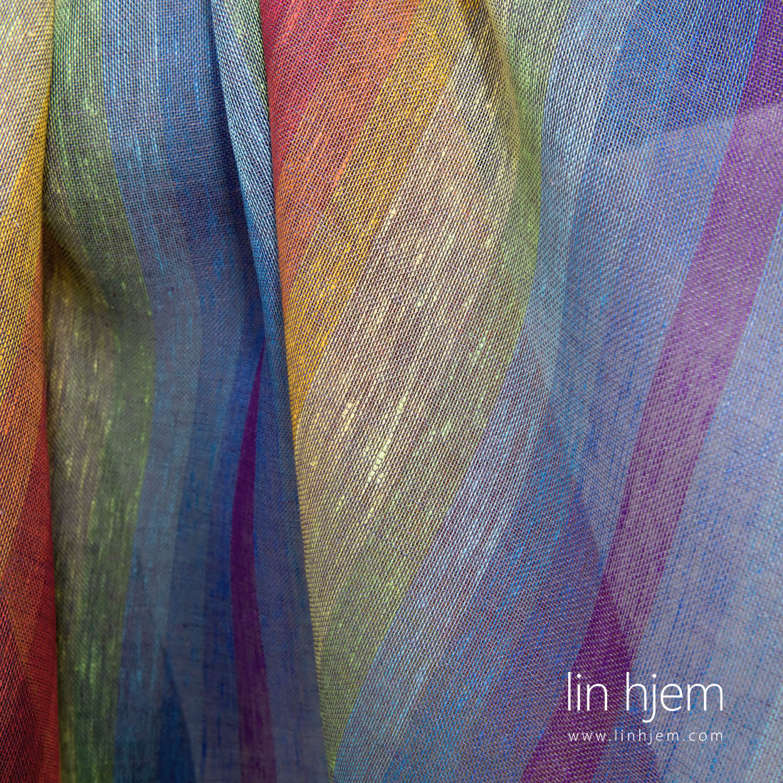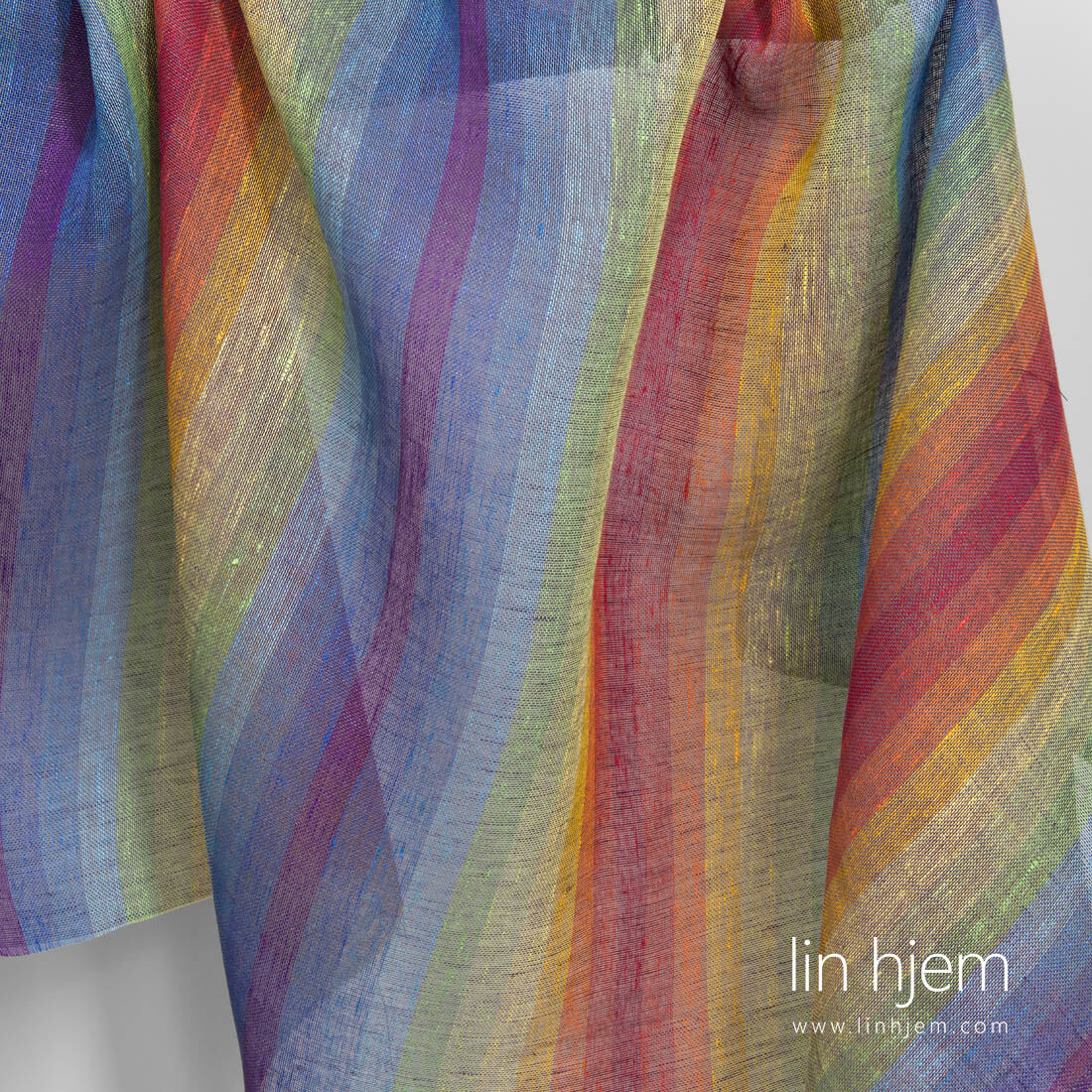 Gjennomsiktig linstoff med vertikale regnbue striper. Lett, løstvevd stoff med regnbue striper passer perfekt til leken design og produkter som gardiner, skjerf og andre typer produkter.