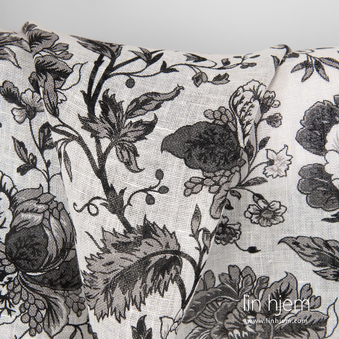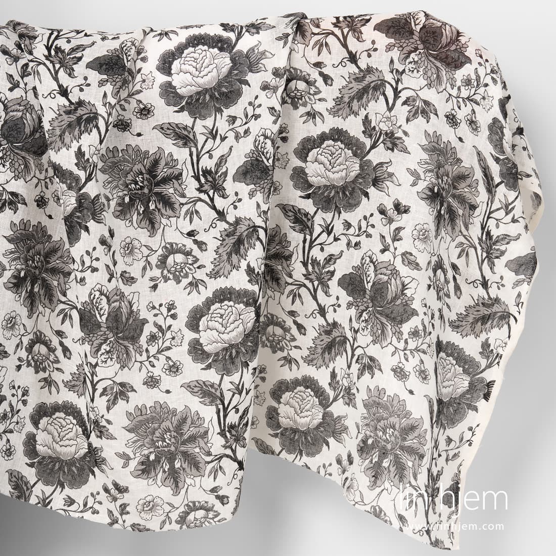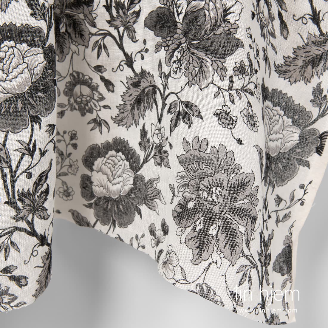 Gjennomsiktig linstoff med svarte blomster på melkehvit bakgrunn. Lett, løstvevd stoff som passer perfekt til å sy gardiner, skjerf, sjal.