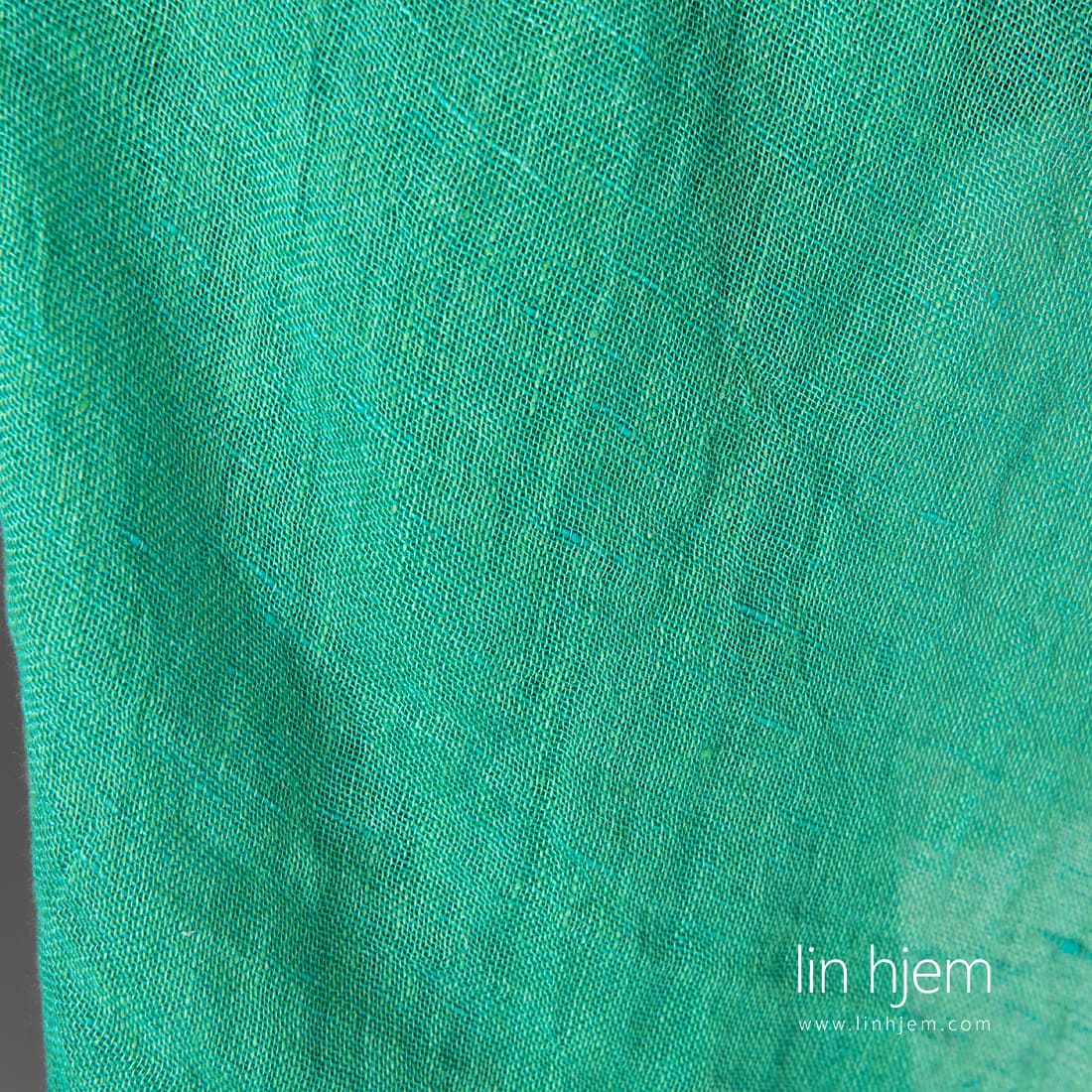 Gjennomsiktig vasket linstoff i lys grønn farge. Lett, løstvevd, ekstremt mykt g skånsomt stoff. Passer best til å skjerfer og gardiner.