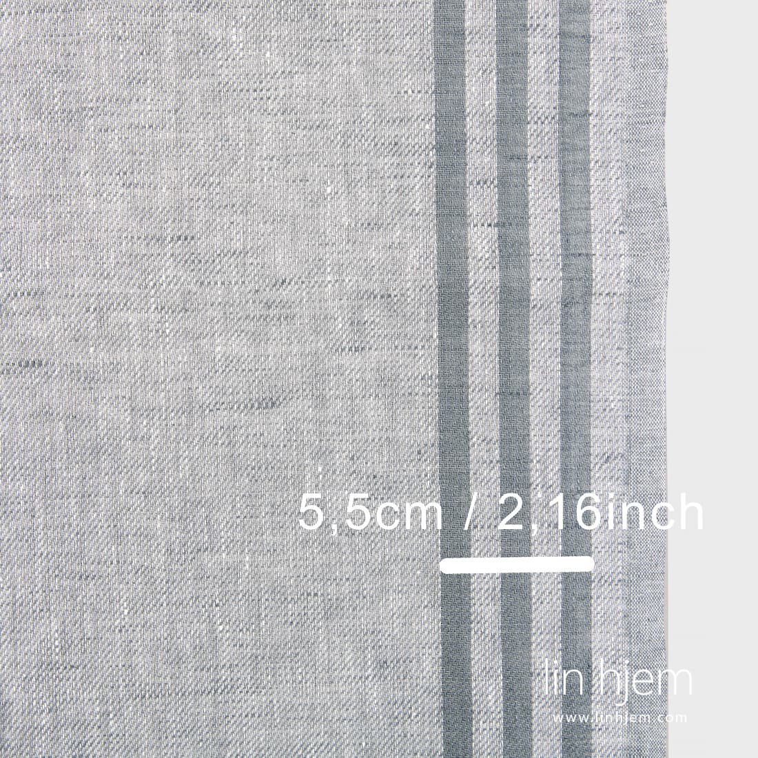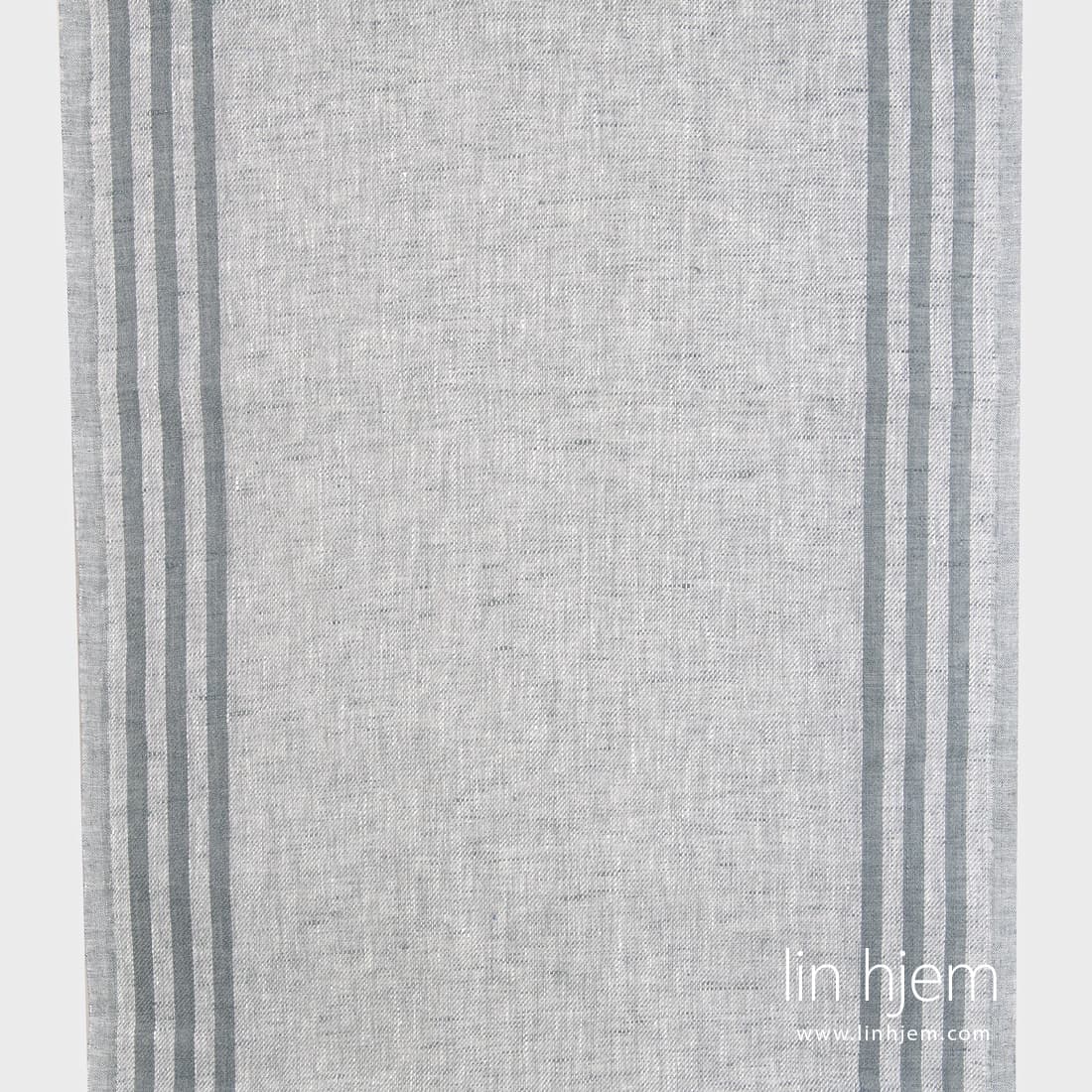 Grå farget linstoff vevd i diagonale striper av grå og hvite garn. 50cm bredt og godt absorberende stoff passer perfekt til å sy kjøkkenhåndklær.