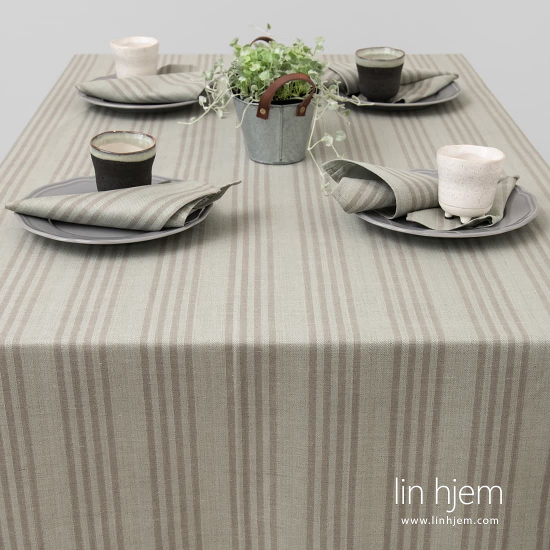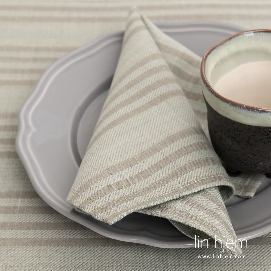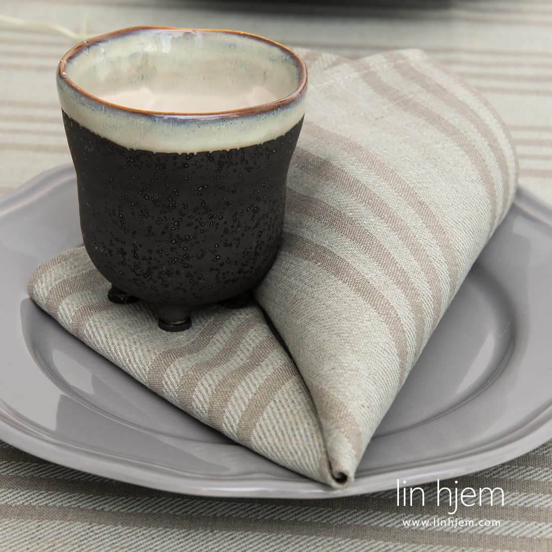 GRASA grønnaktig serviett. Produktets stoff ble vevd av naturlig (ufarget) lingarn og gammelgrønne bomullsgarn. Servietten dekorert med striper som er vevd av naturlig og grønnaktig grå garn. Rolige og subtile farger. Kombiner med GRASA duk.