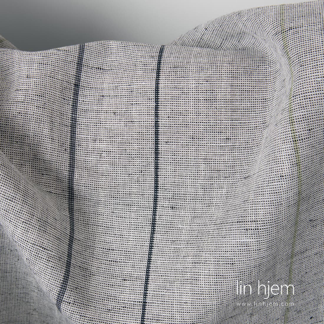 Grått halvlin stoff med svarte striper. Dette lin-bomulls stoff er vevd av lysegrå og svarte garn dekorert med vertikale tynne striper av svart, grønnaktig og hvit farge. Tettvevd, holdbart, varig, middels tykkelse. Passer til klær, hjem tekstil produkter.