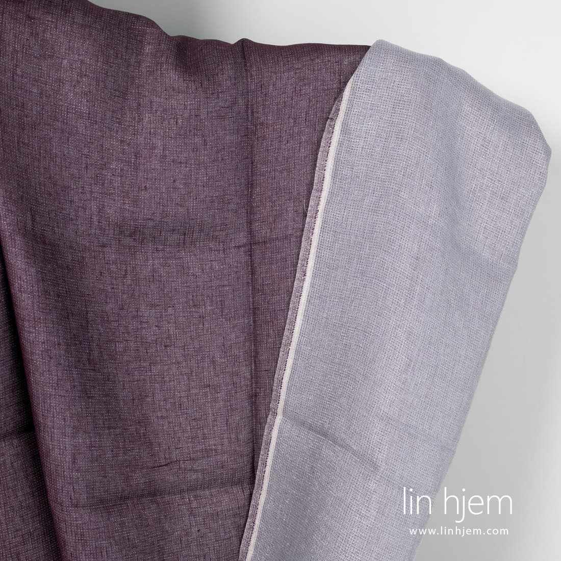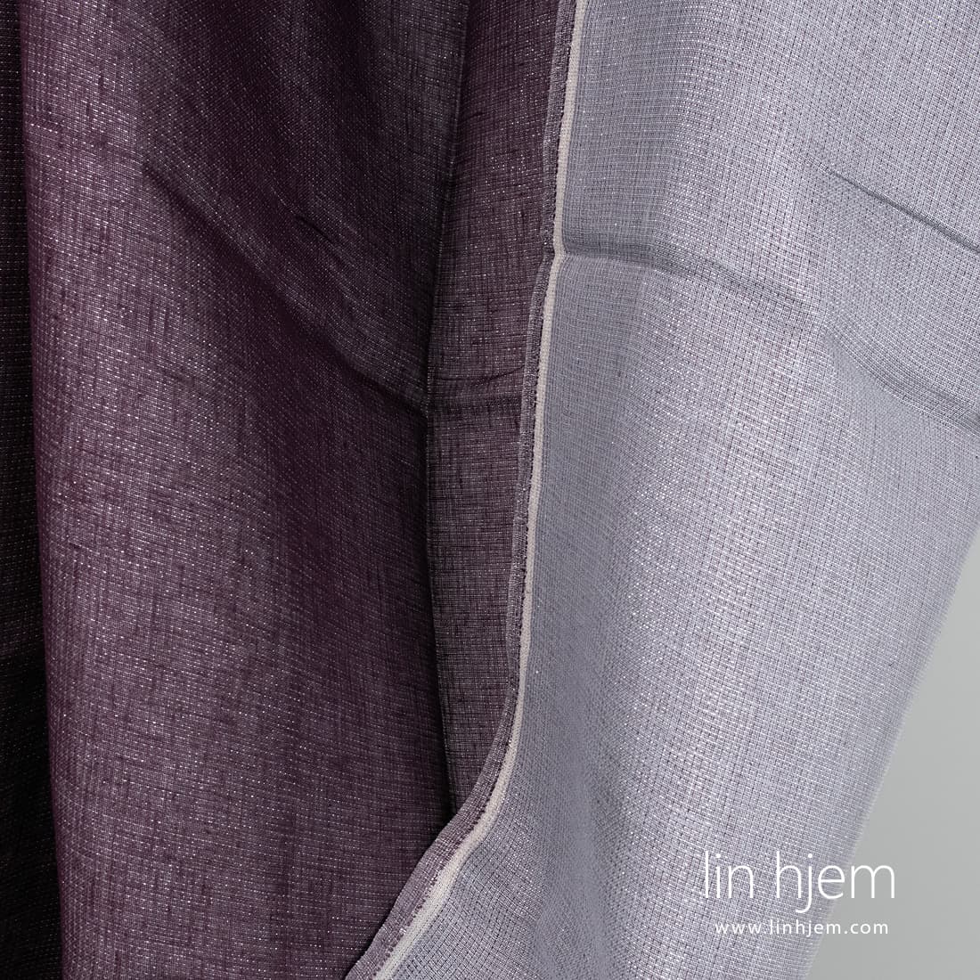 Grått-lilla skinnende linstoff. Dette stoffet er tosidig, vevd av lilla og blåaktig grå lingarn og sølv farget polyester garn. Den ene siden er lilla, den andre siden i grå farge. Holdbart, tettvevd, middels tykkelse. Sy festlig klær, duker, servietter, dekorative putetrekk. Begge sidene kan brukes.