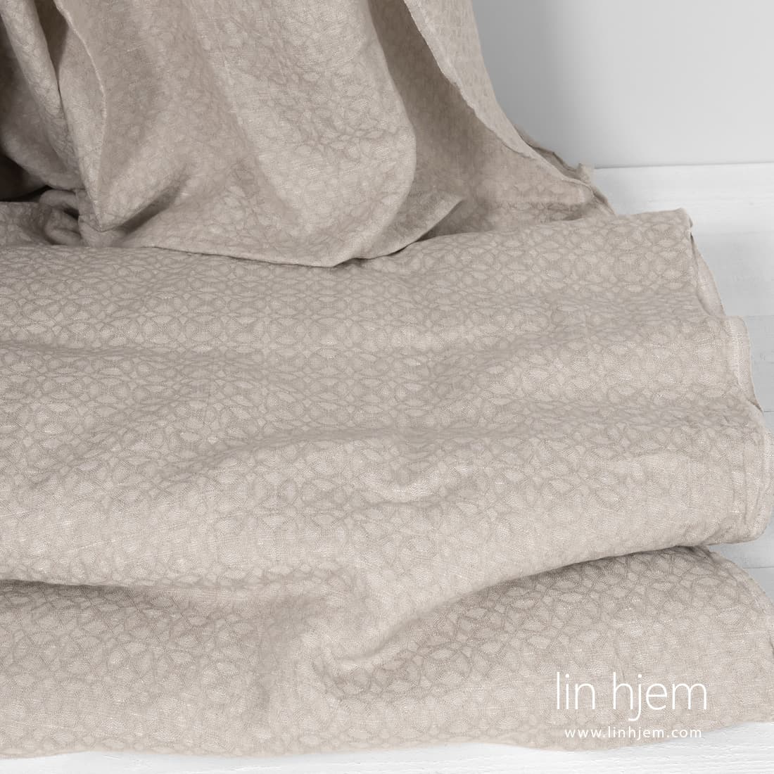 Grått mønstret lin-ull stoff vasket. Vevd av hvite lin-ull garn og naturlig (ufarget) lingarn i geometrisk mønster. Spesielt vasket for å gjøre dette stoffet ekstremt mykt, skånsomt og ikke minst behagelig mot huden. Passer perfekt til å sy produkter som klær, skjerf, sjal.