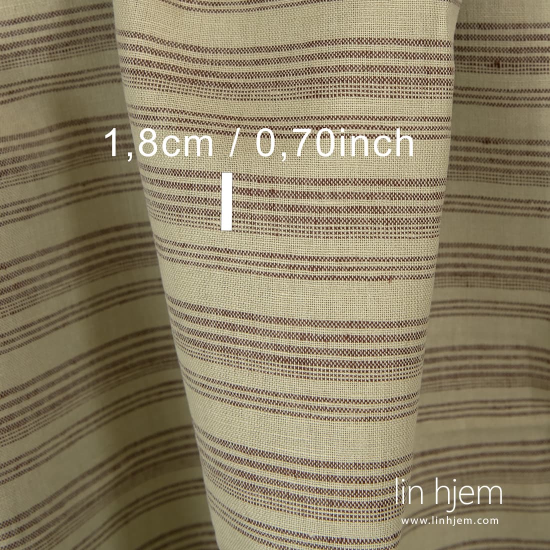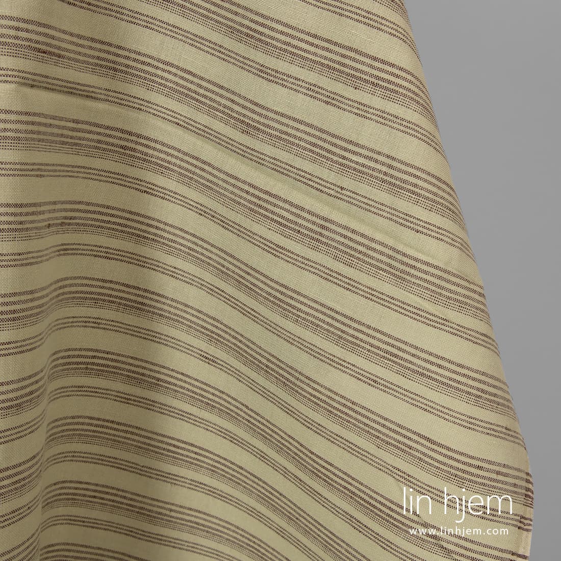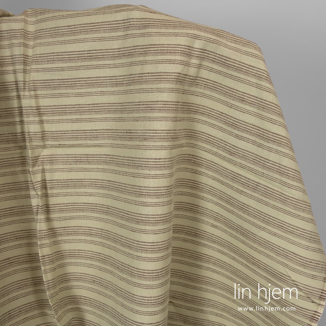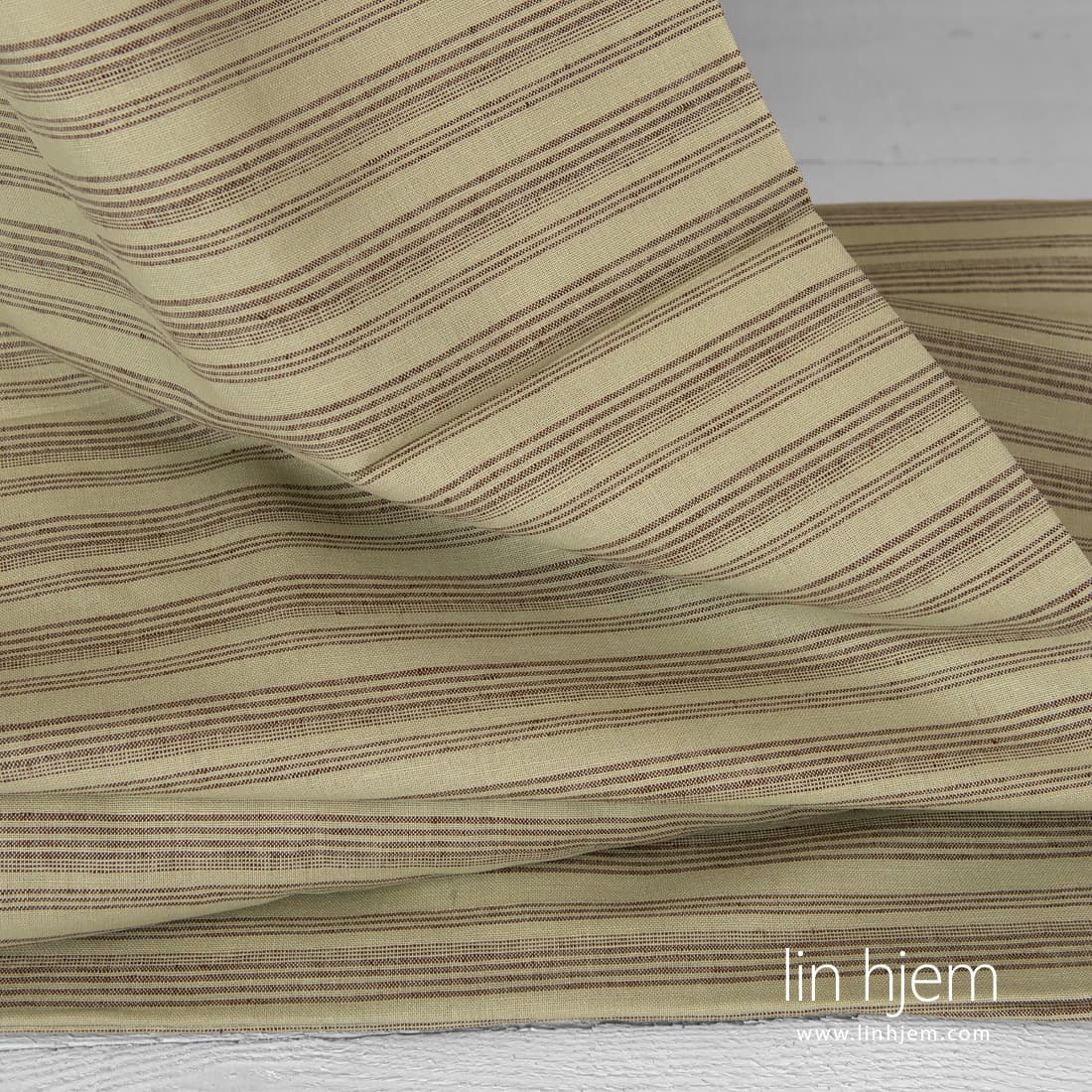 Grønnaktig halvlin stoff i horisontale brune striper som er holdbart, tettvevd, middels tykkelse. Passer best til å sy klær og hjem tekstil produkter.