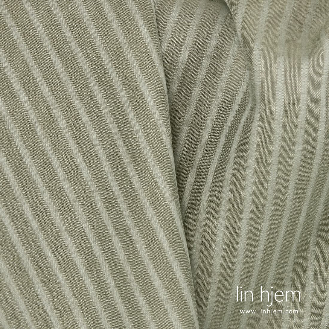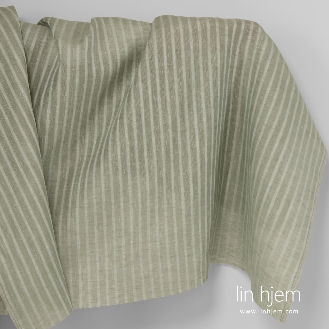 Grønnaktig linstoff i gjennomsiktige og tette vertikale striper. Stoffet ble vevd av gammelgrønne og mint farget lin garn. Dette stoffet er lett. Derfor passer best til å sy gardiner, skjerf, sjal.