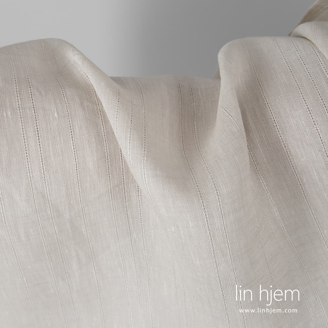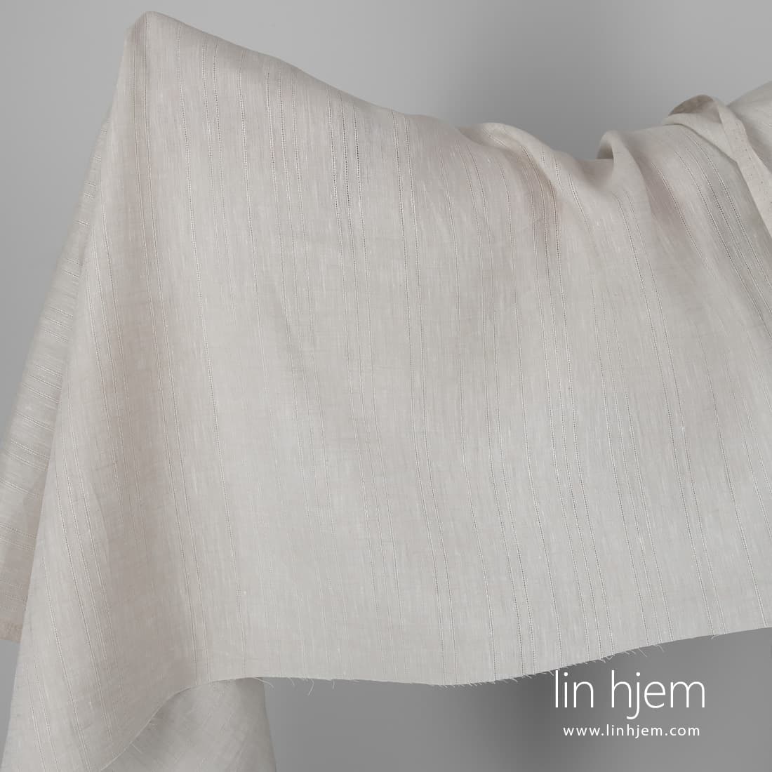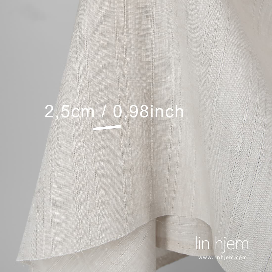 Gulaktig brunt linstoff med gjennomsiktige vertikale striper. Melange stoff vevd av brunaktige og hvite lingarn. Holdbart, tettvevd, lett, middels tykkelse. Passer til klær og hjem tekstil produkter.