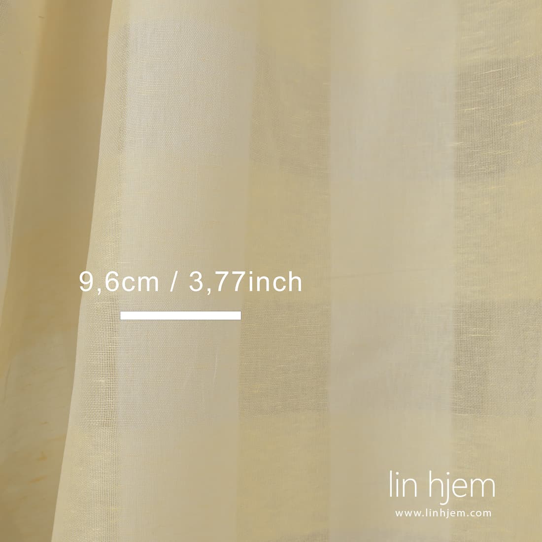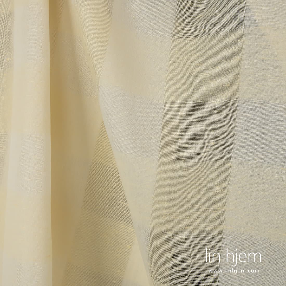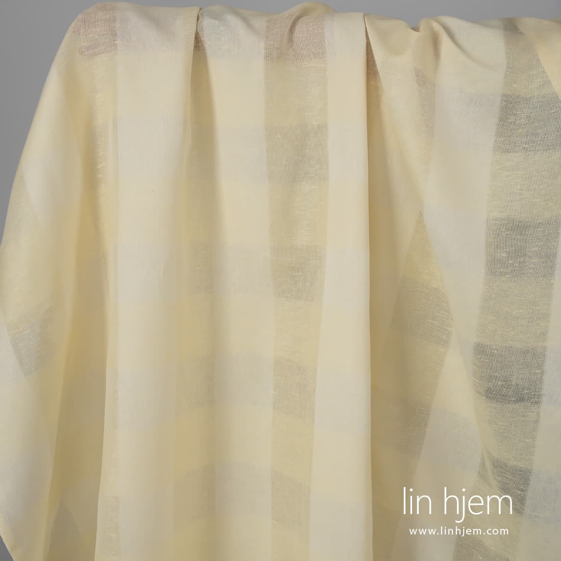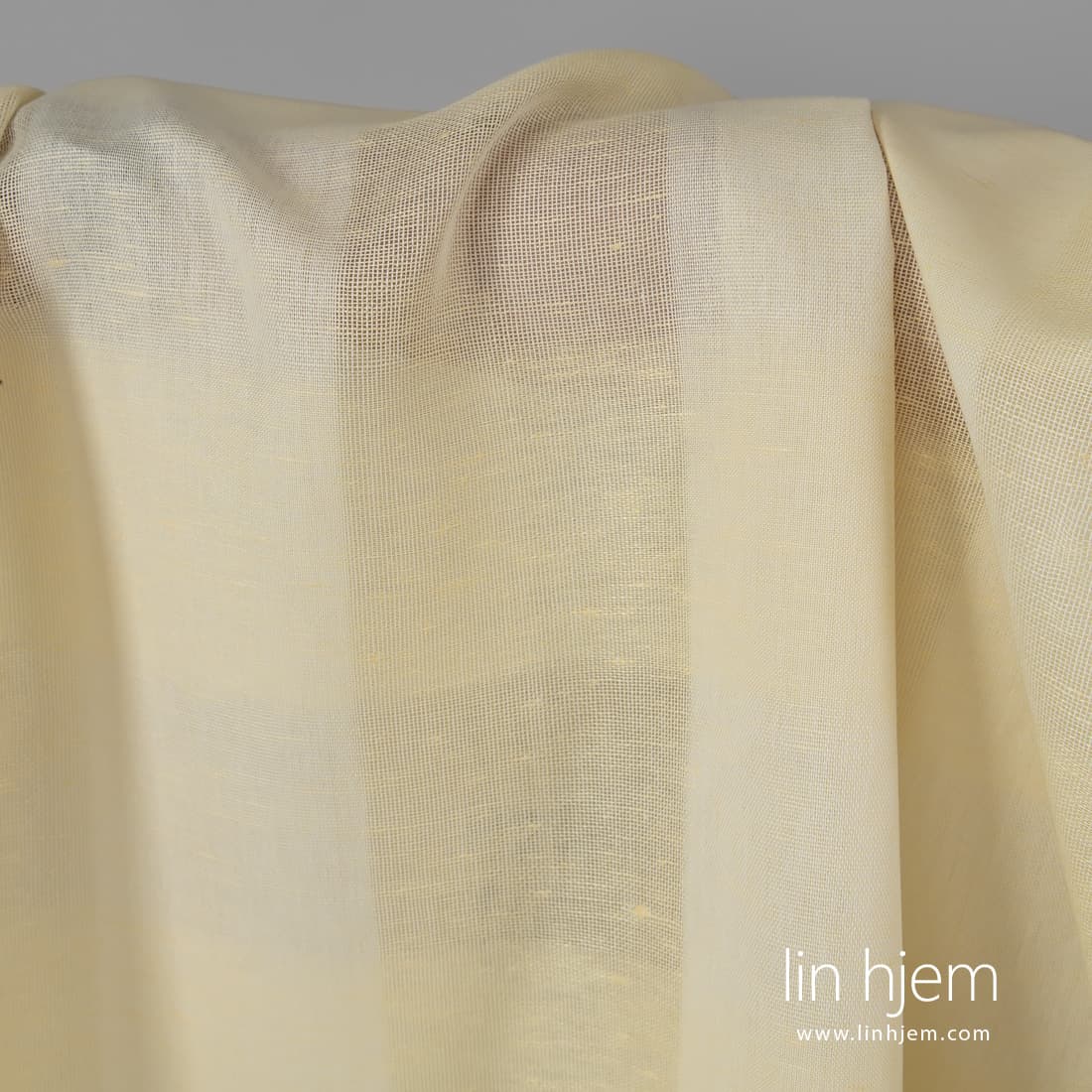Halvlin stoff vevd i gjennomsiktige (løstvevde) og tettvevde striper av gulaktige lingarn og hvite bomullsgarn. Lett, holdbart stoff som passer til gardiner, duker.
