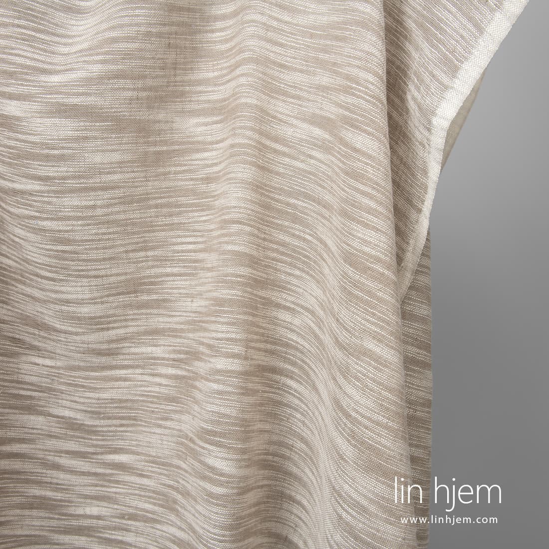 • Beige lin-bomull stoff med hvite striper passer til å sy gardiner, skjerf