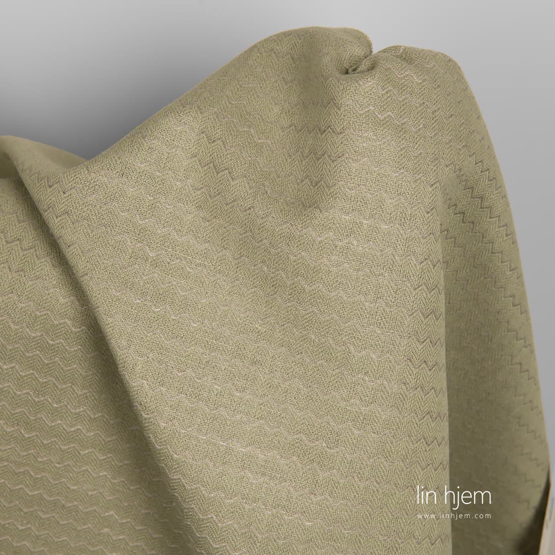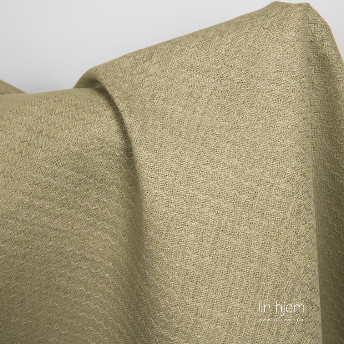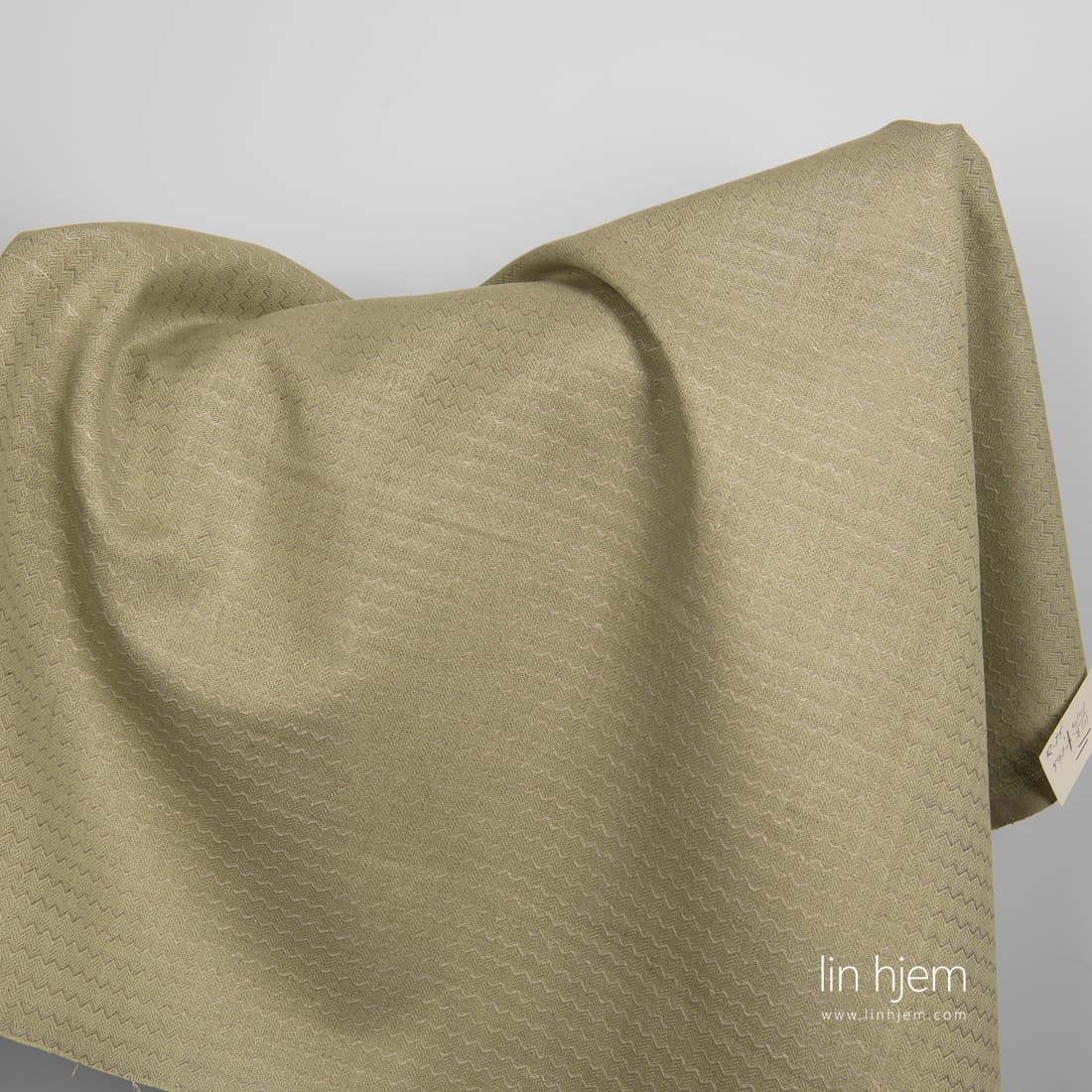 Halvlin grønt stoff med bølger som ble vevd av naturlig(ufarget) stoff. Middels tykkelse, holdbart, tettvevd, subtilt lin-bomulls stoff.