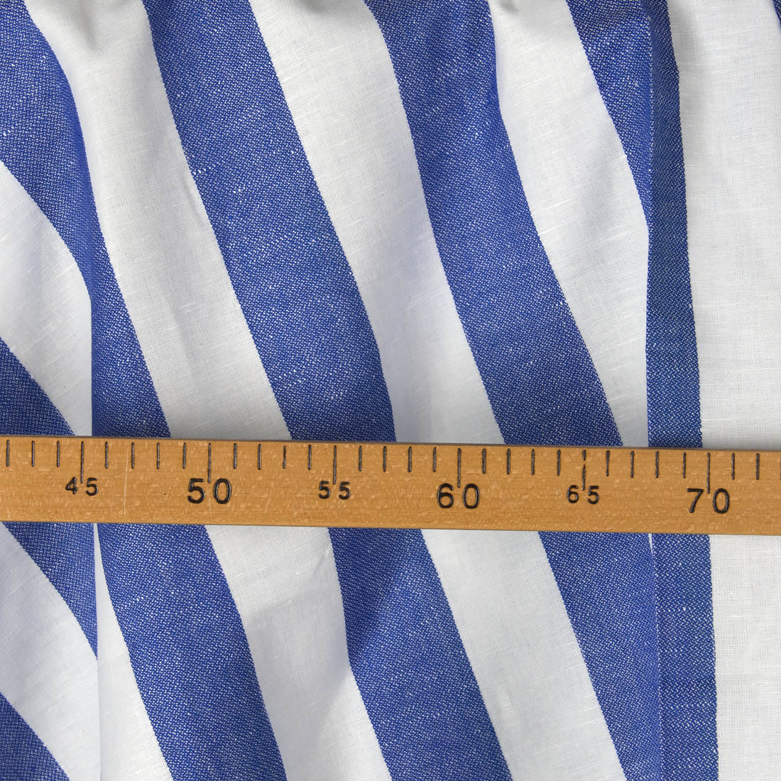 • Lin-bomull stoff med snøhvite, blå striper, 140cm bredt