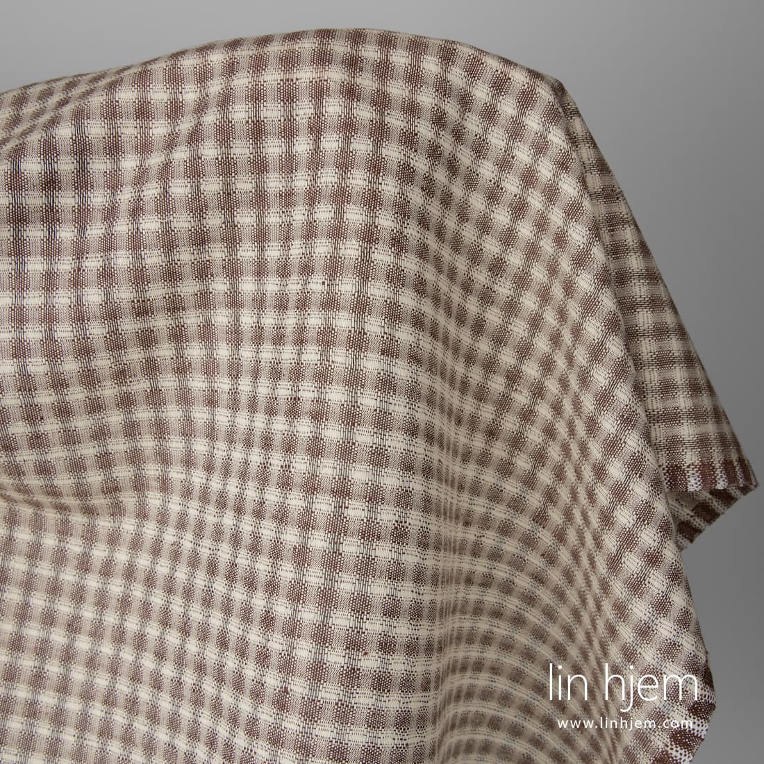 • Halvlin stoff med gjennomsiktige ruter vevd av lys gult (krem) og mørkebrunt garn
