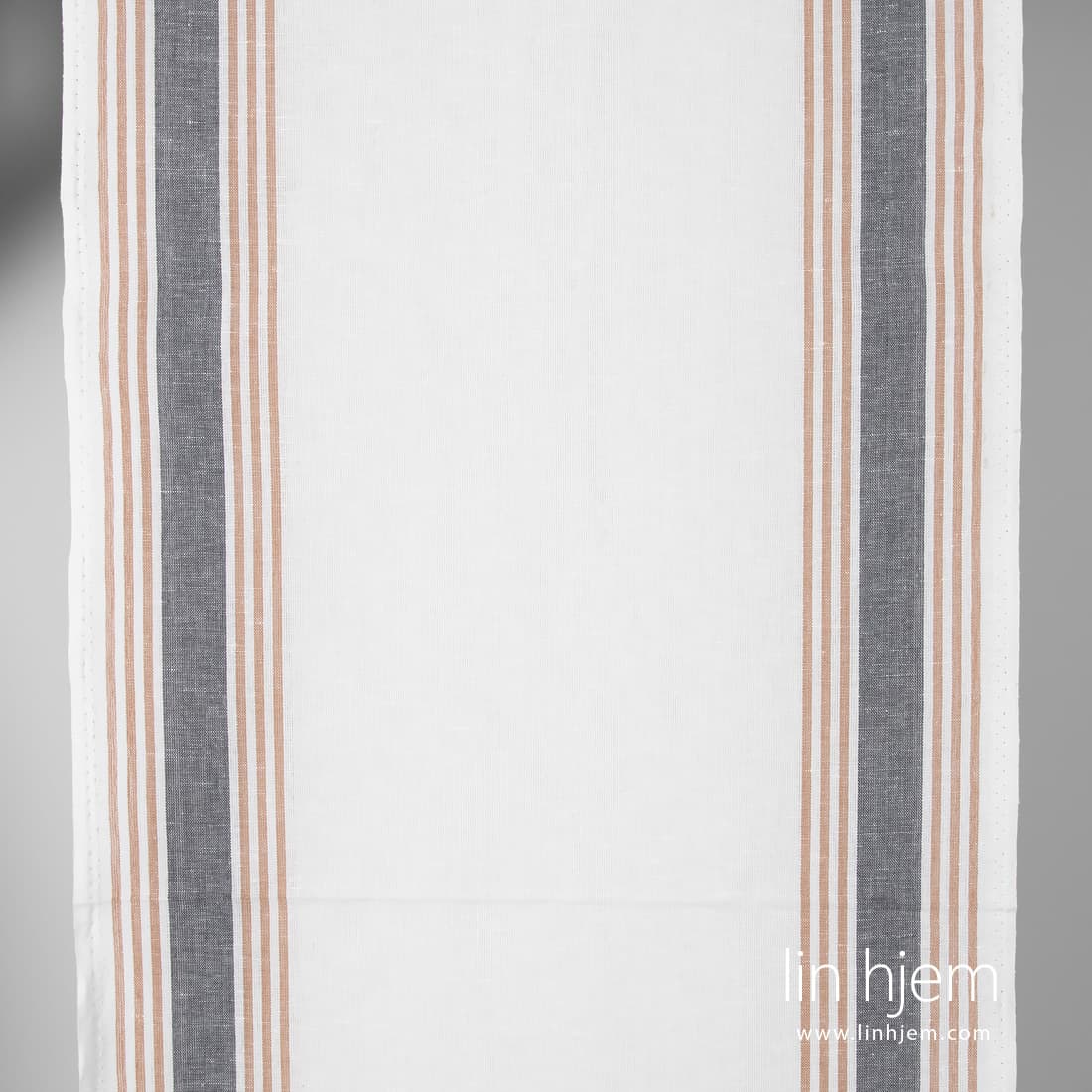 Halvlin stoff i grå/brune vertikale striper på melkehvit bakgrunn. 50cm bredde. Lett, holdbart, tettvevd lin-bomull stoff passer best til å sy kjøkkenhåndklær.