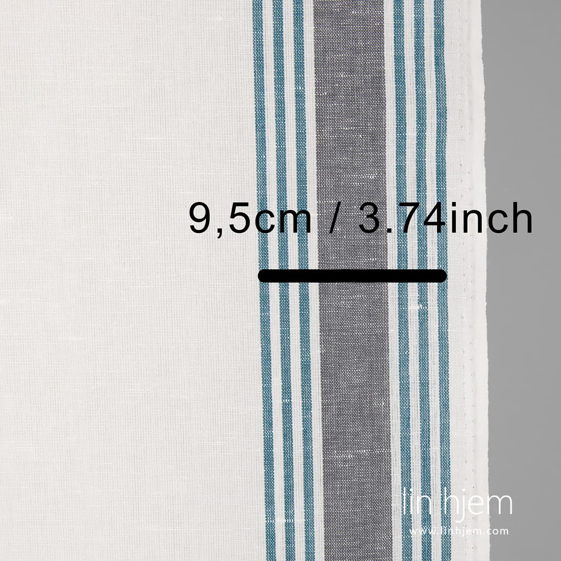 Halvlin stoff med grå/blå striper på melkehvit bakgrunn. Tettvevd, holdbart, absorberer fuktighet godt. 50cm bredde. Dette stoffet passer best til å sy kjøkkenhåndklær.