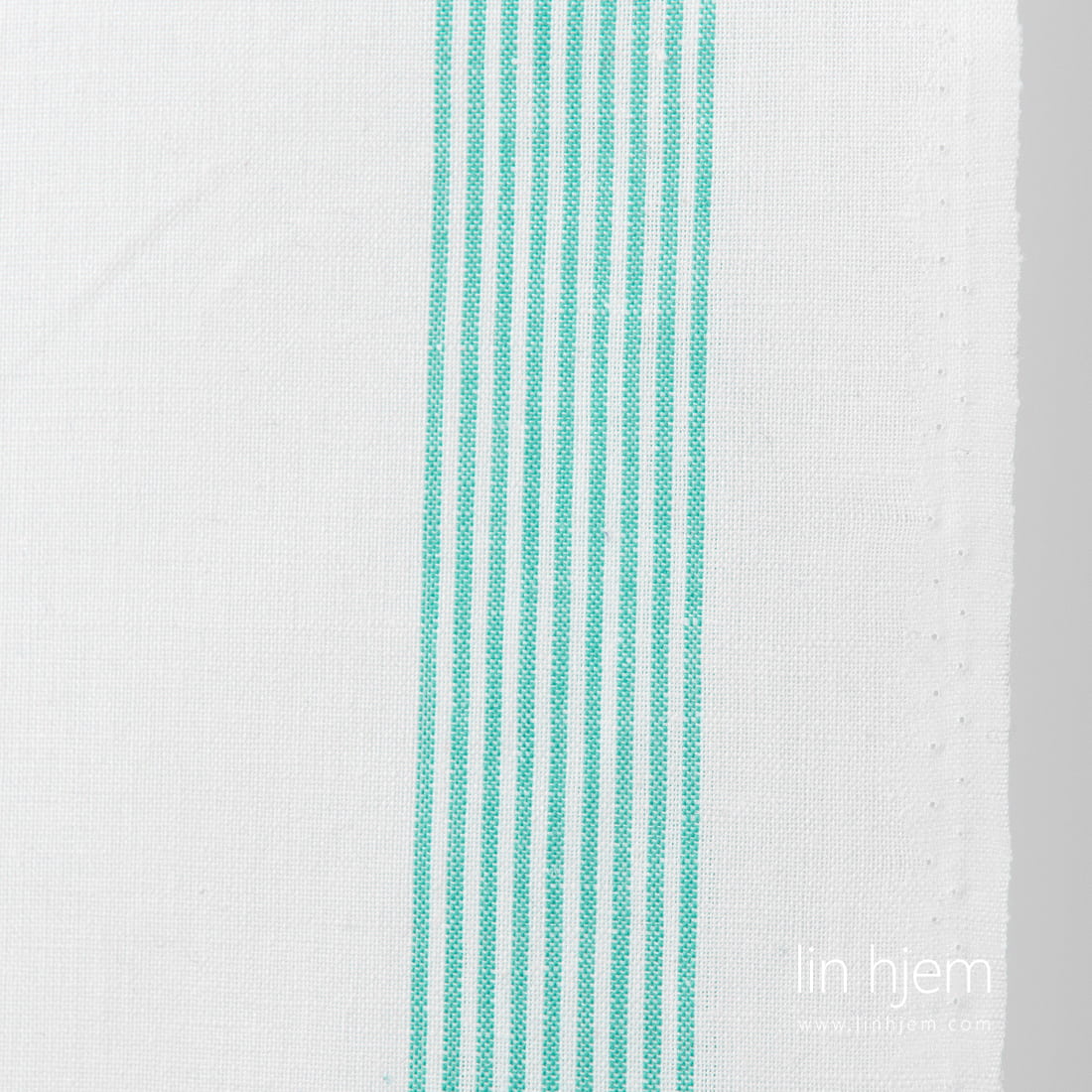 Halvlin stoff med grønne striper på hvit bakgrunn. Stoffet er tettvevd, holdbart, tøft, middels tykkelse og absorberer fuktighet veldig godt. Passer perfekt til å sy kjøkkenhåndklær.