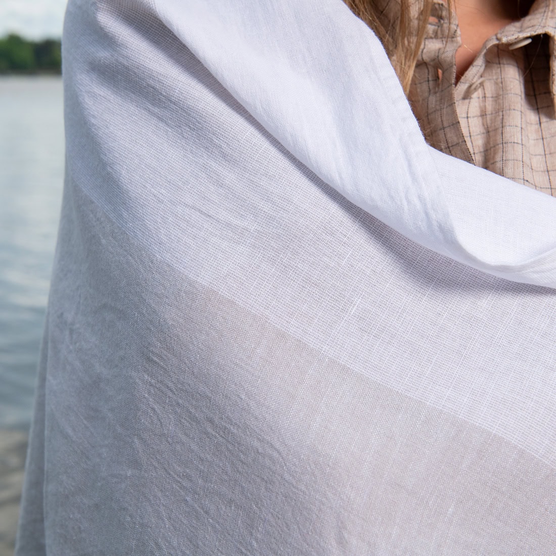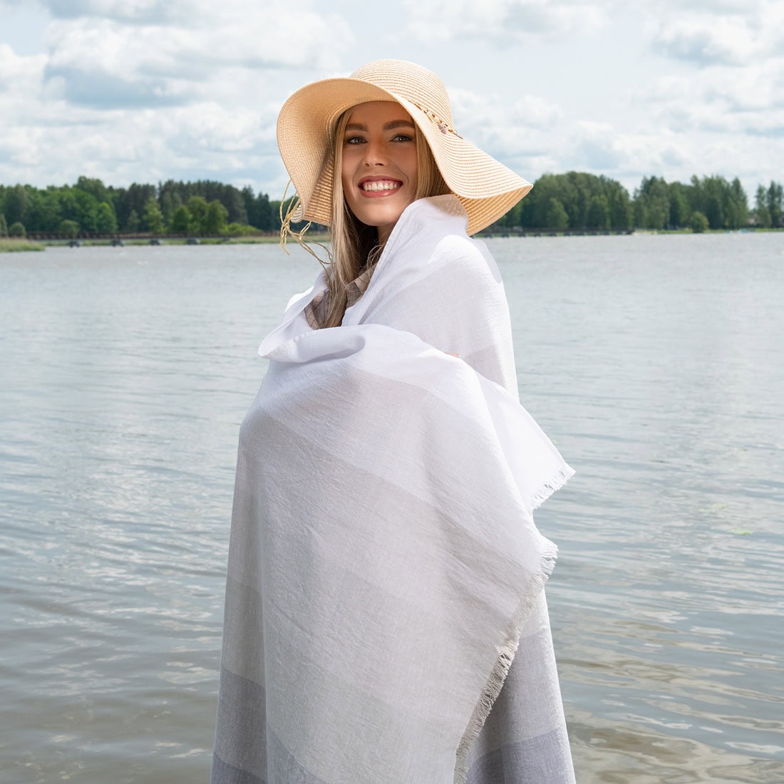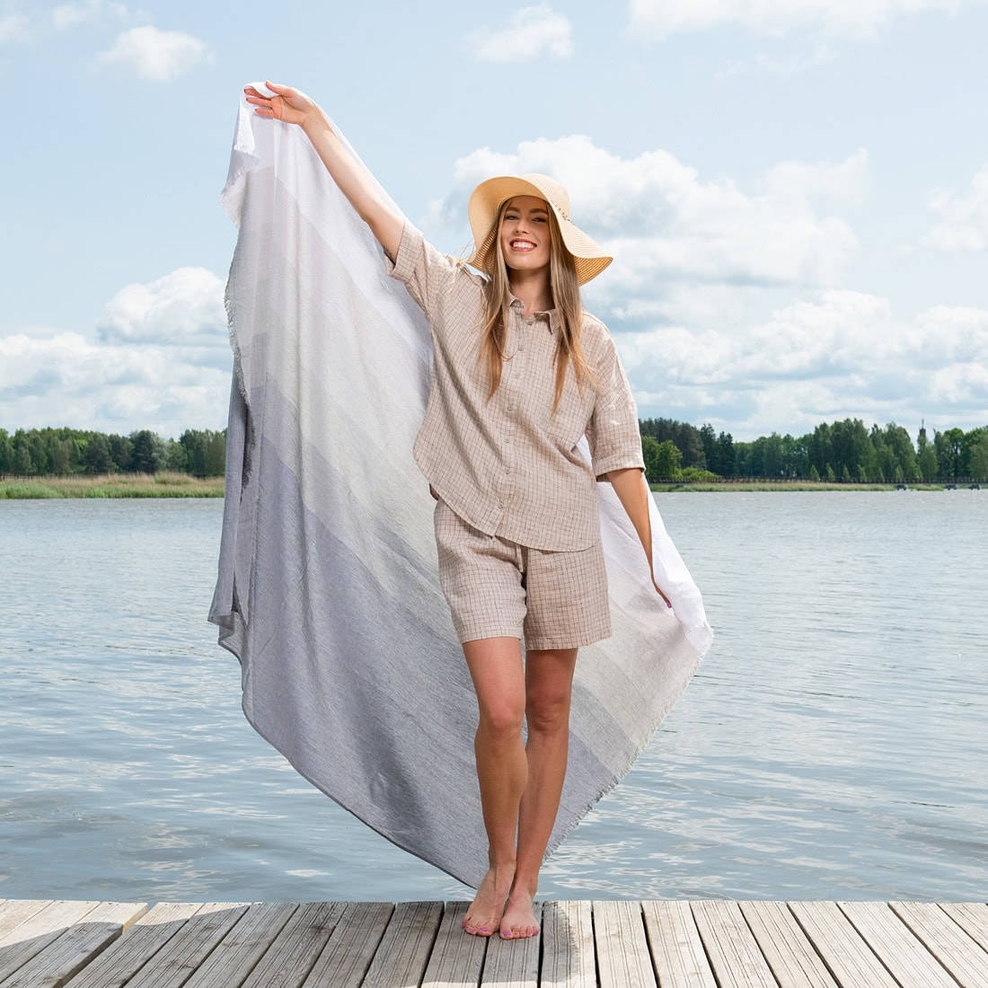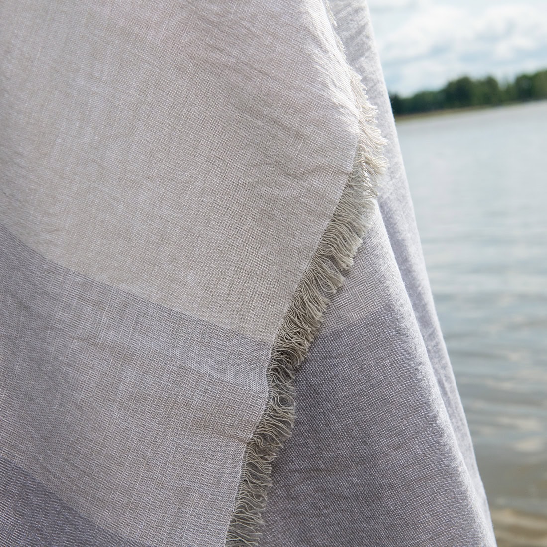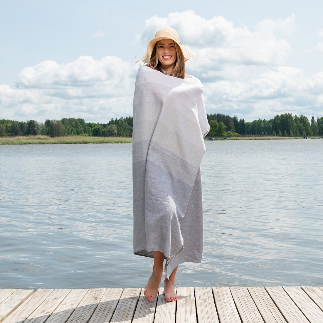 Halvlin strandhåndkle i grå brede striper. Vakre matchende farger blekner fra mørk grå, grønnaktig grå og sandgrå til hvit farge. 2cm frynser på kortsidene og enkelt brettet kantene på langsidene. Håndkleet er veldig mykt og skånsomt. vasket. Dette stoffet absorberer fuktighet veldig godt.