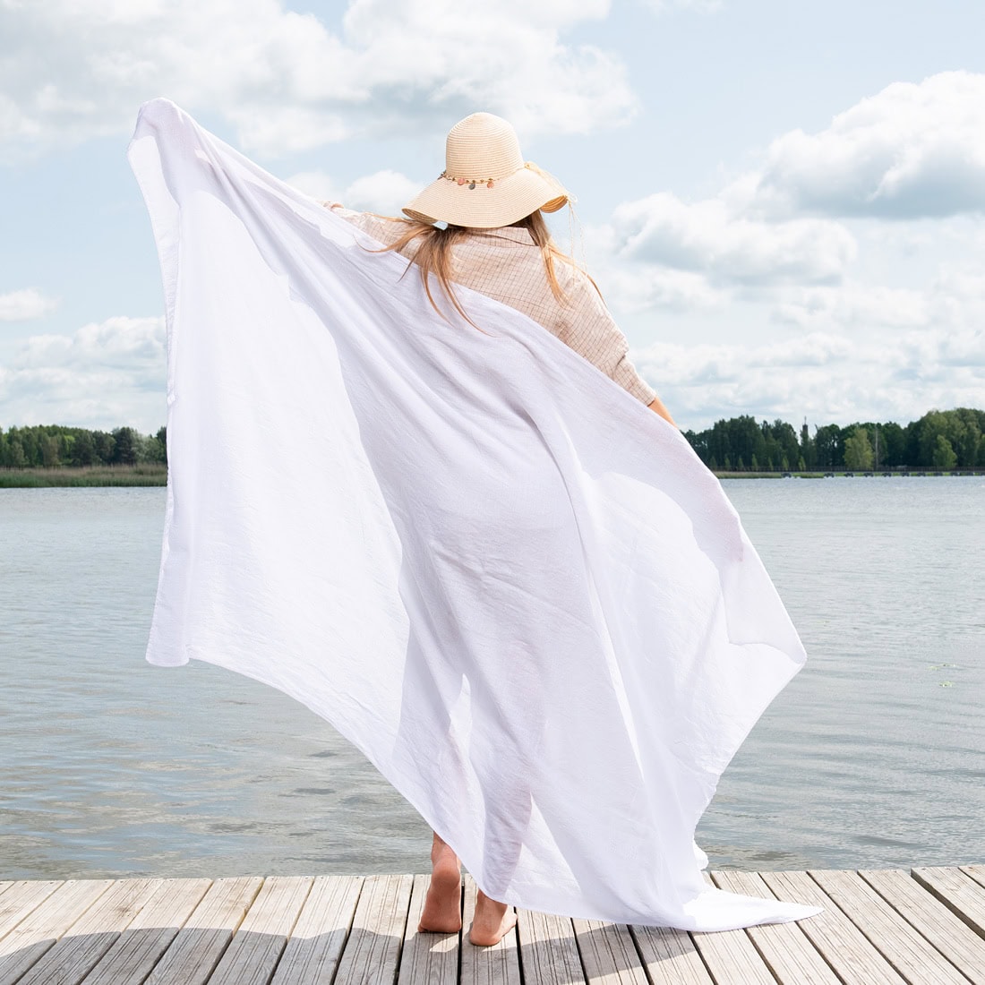 Halvlin strandhåndkle i hvit farge. Veldig lett og universalt håndkleet. Stoffet ble spesielt vasket for å gjøre dette produktet ekstremt mykt og skånsomt. Behagelig mot huden og uerstattelig ved sjøen!