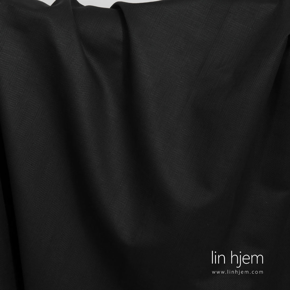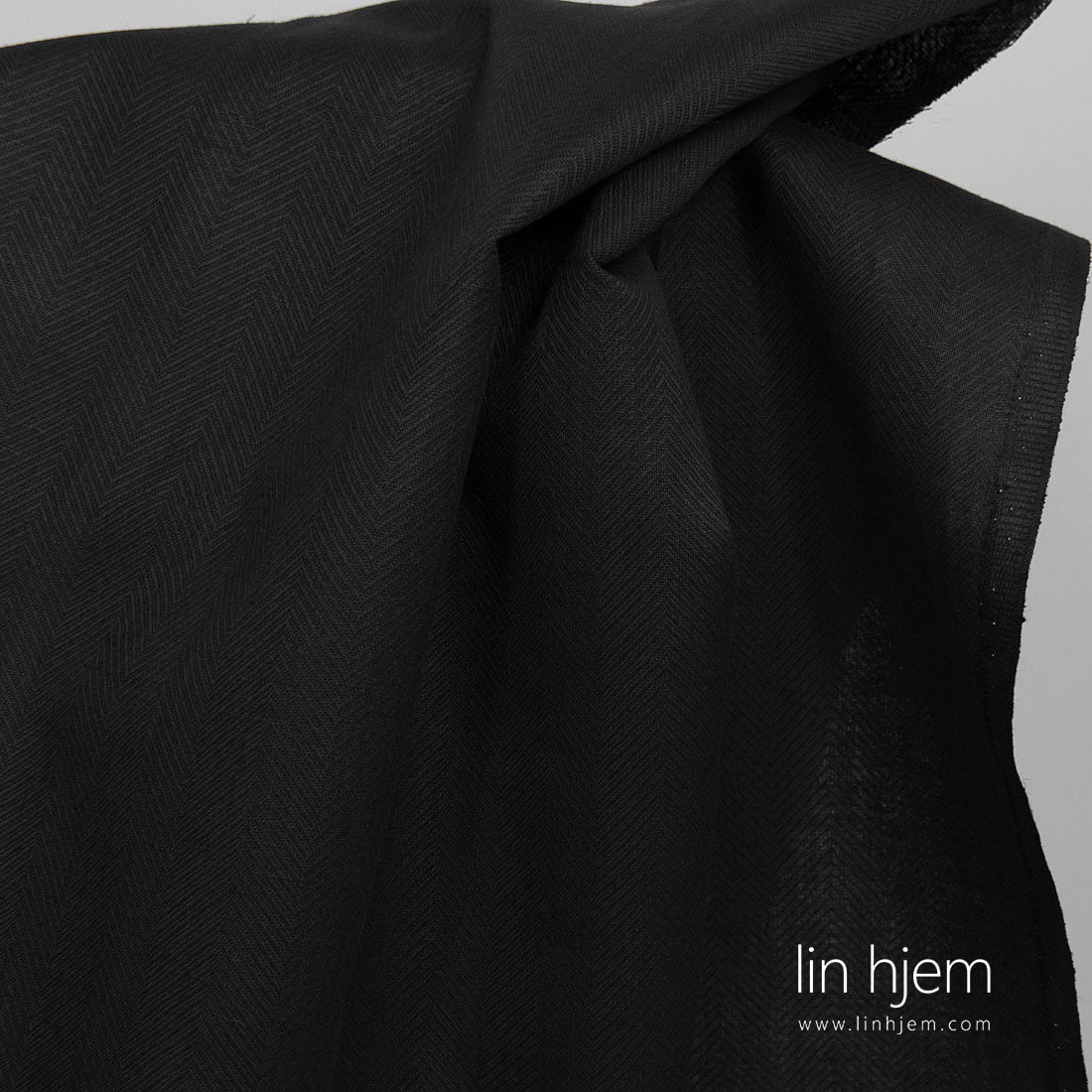 Halvlin svart stoff i „gran“ mønster. Middels tykkelse og vekt, holdbart, tettvevd.