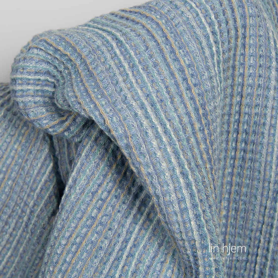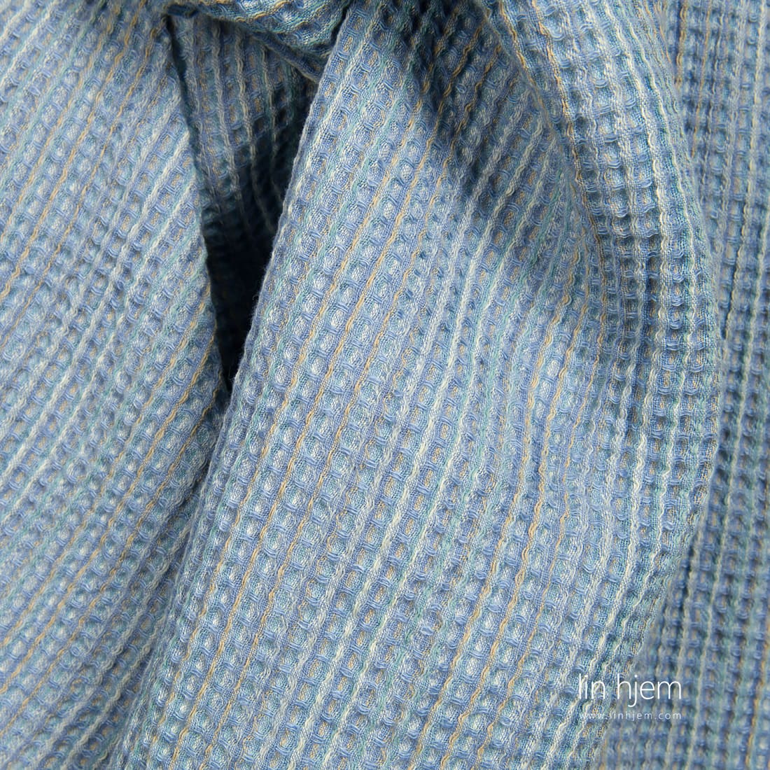 Halvlin vasket blått stoff vevd fra blå, melkehvite, blåaktig grå, sand farget lin og bomull garn. Disse fargene skaper et lekent fargerikt utseende. Stoffet er spesielt vasket som gjør dette produktet veldig mykt, skånsomt. Passer til å sy håndklær, forklær.