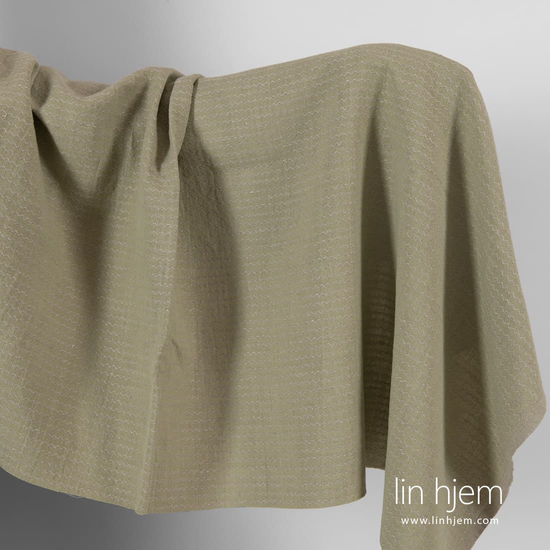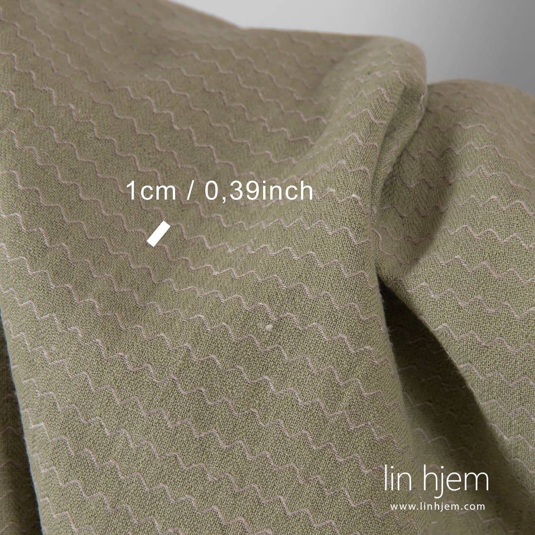 Halvlin vasket grønt stoff i bølgemønster. Bølgemønster ble vevd fra naturlig(ufarget) lingarn. Stoffet ble spesielt vasket som gjør dette halvlin stoffet ekstremt mykt, skånsomt. Krymper ikke. Veldig holdbart, tettvevd og av middels tykkelse.