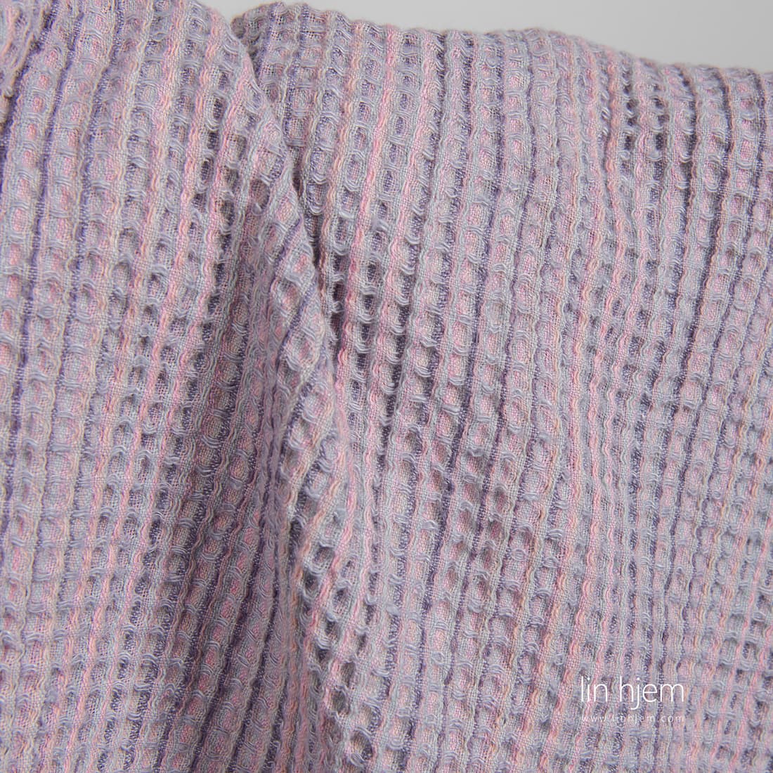 Halvlin vasket lyselilla stoff. Vevd fra lysegrå, rosa, blå, lilla lin og bomull garn. Spesielt vasket derfor er stoffet mykt, skånsomt. Krymper ikke.