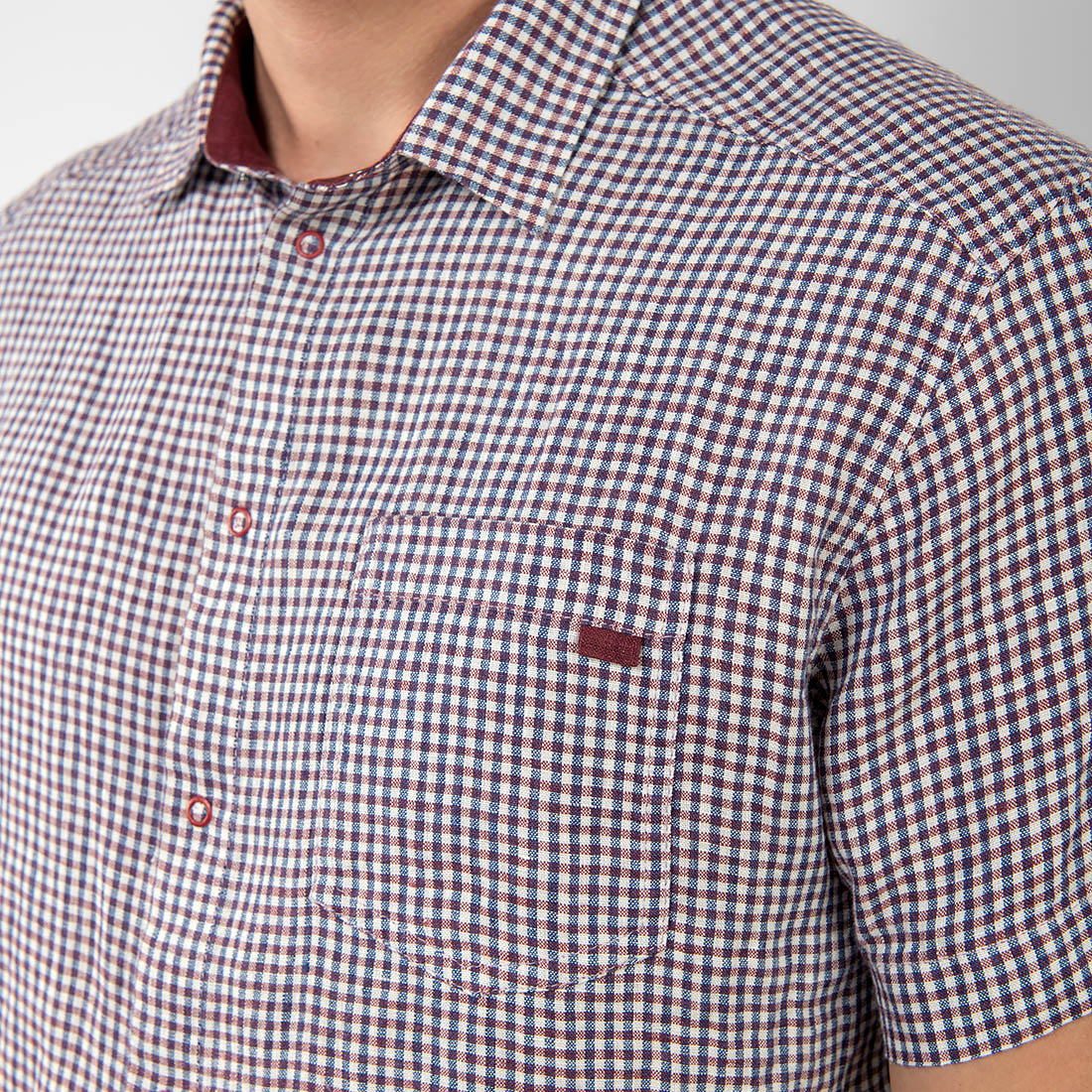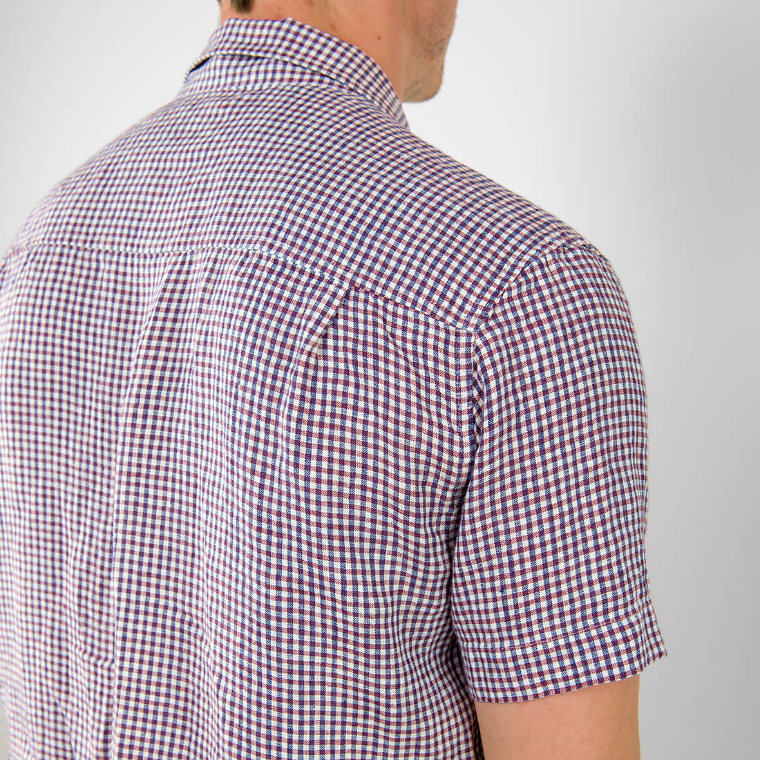 - Detaljer: smal ståkrage, knapper, lomme på venstre side, korte ermer