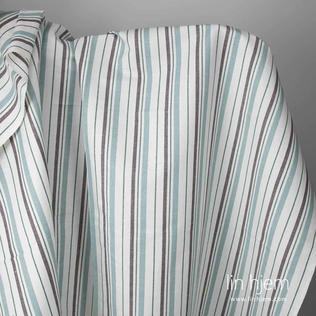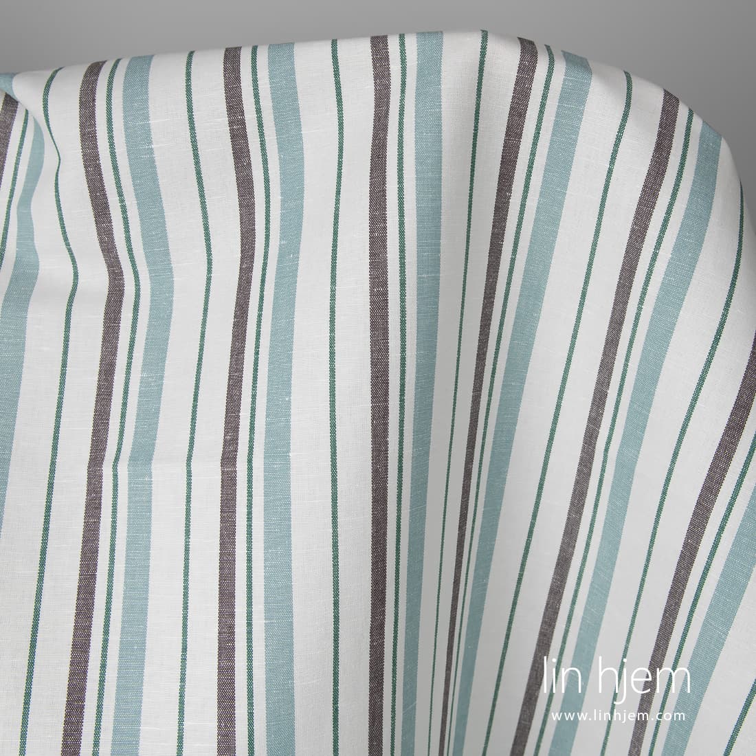 • Melkehvitt halvlin stoff med grønne og brune striper