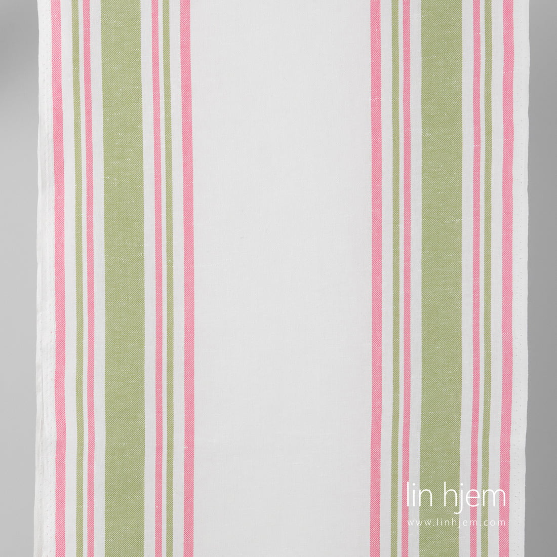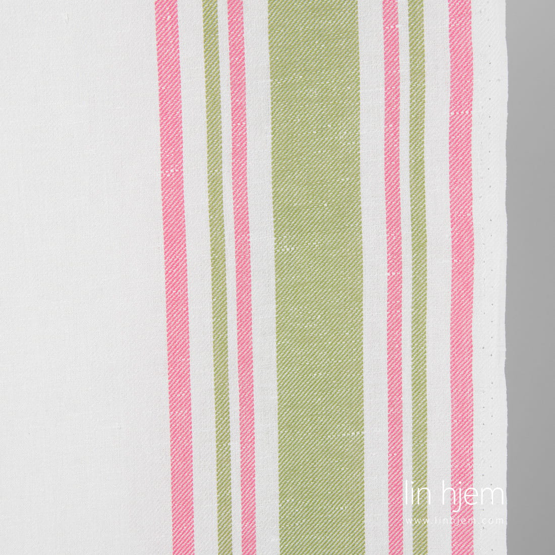 Hvitt halvlin stoff med grønne/rosa striper. Vevd i diagonale striper, tettvevd, holdbart, tøft, av middels tykkelse stoff som absorberer fuktighet veldig godt derfor passer perfekt til å sy kjøkkenhåndkle.