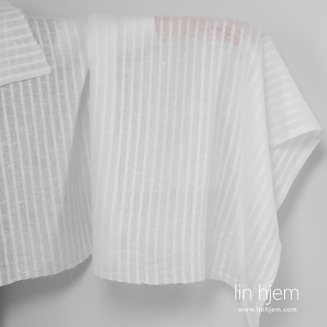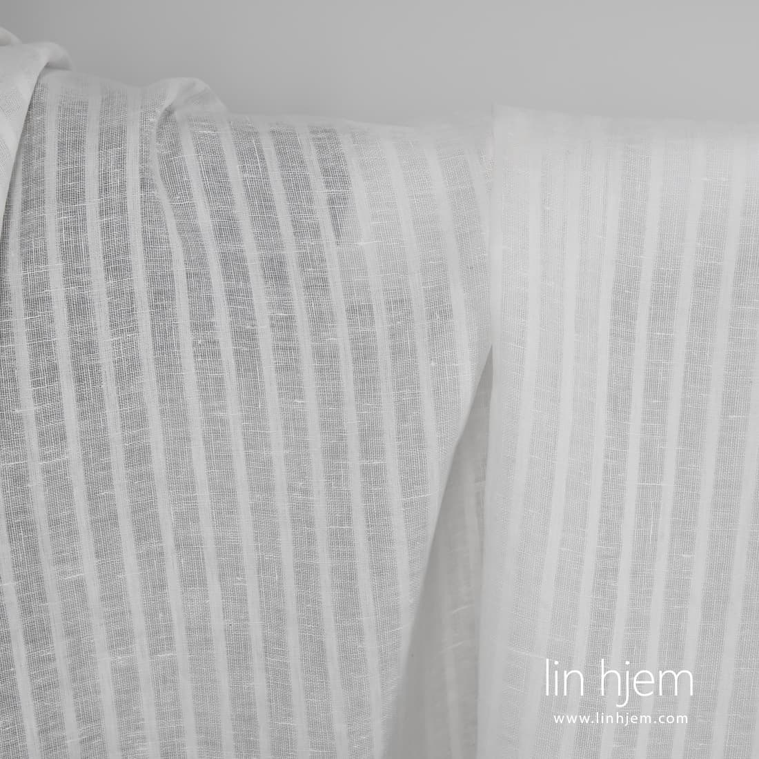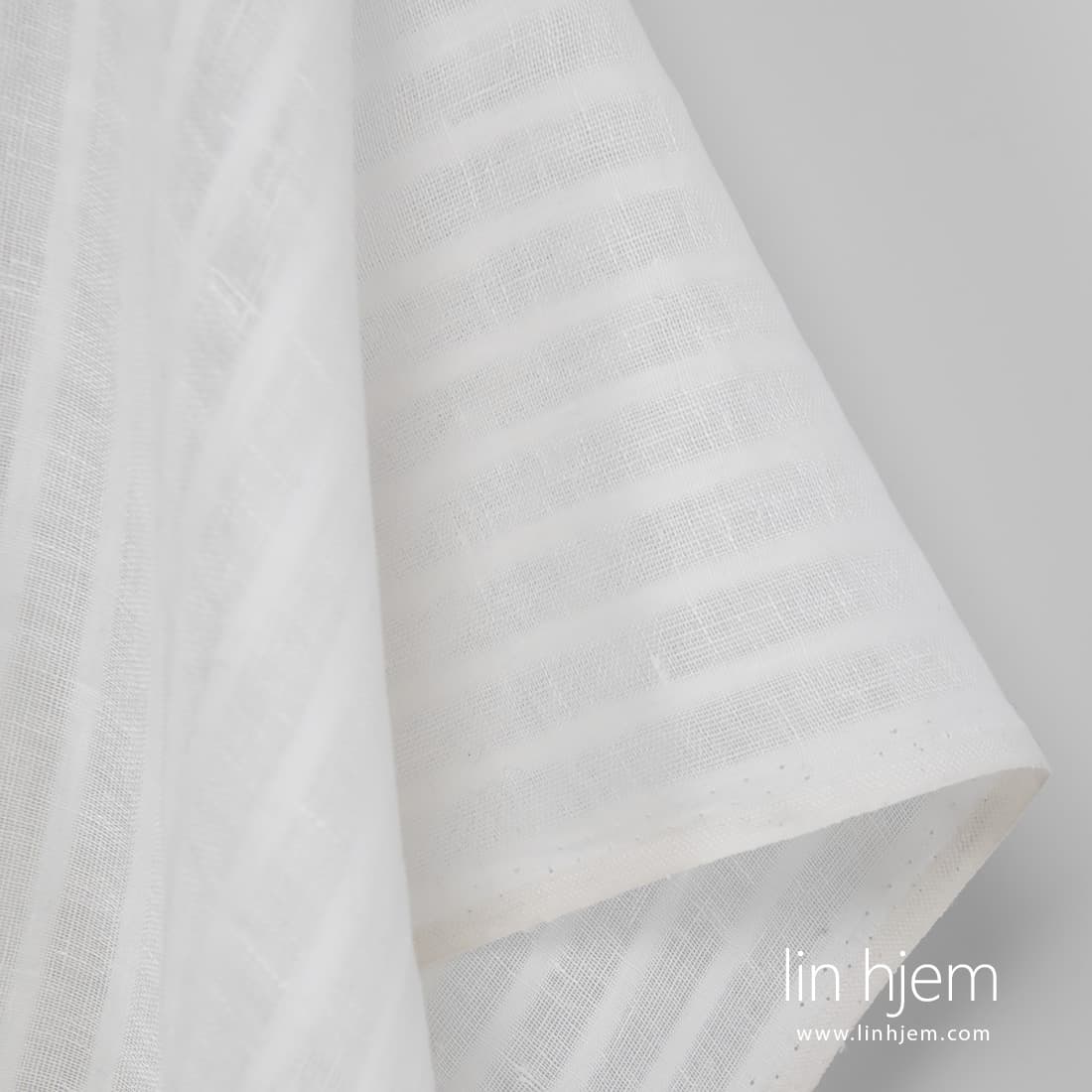 Melkehvitt linstoff i gjennomsiktige striper. Tettvevd og løstvevde striper vevd vertikalt. Dette linstoffet passer best til å sy skjer og gardiner.
