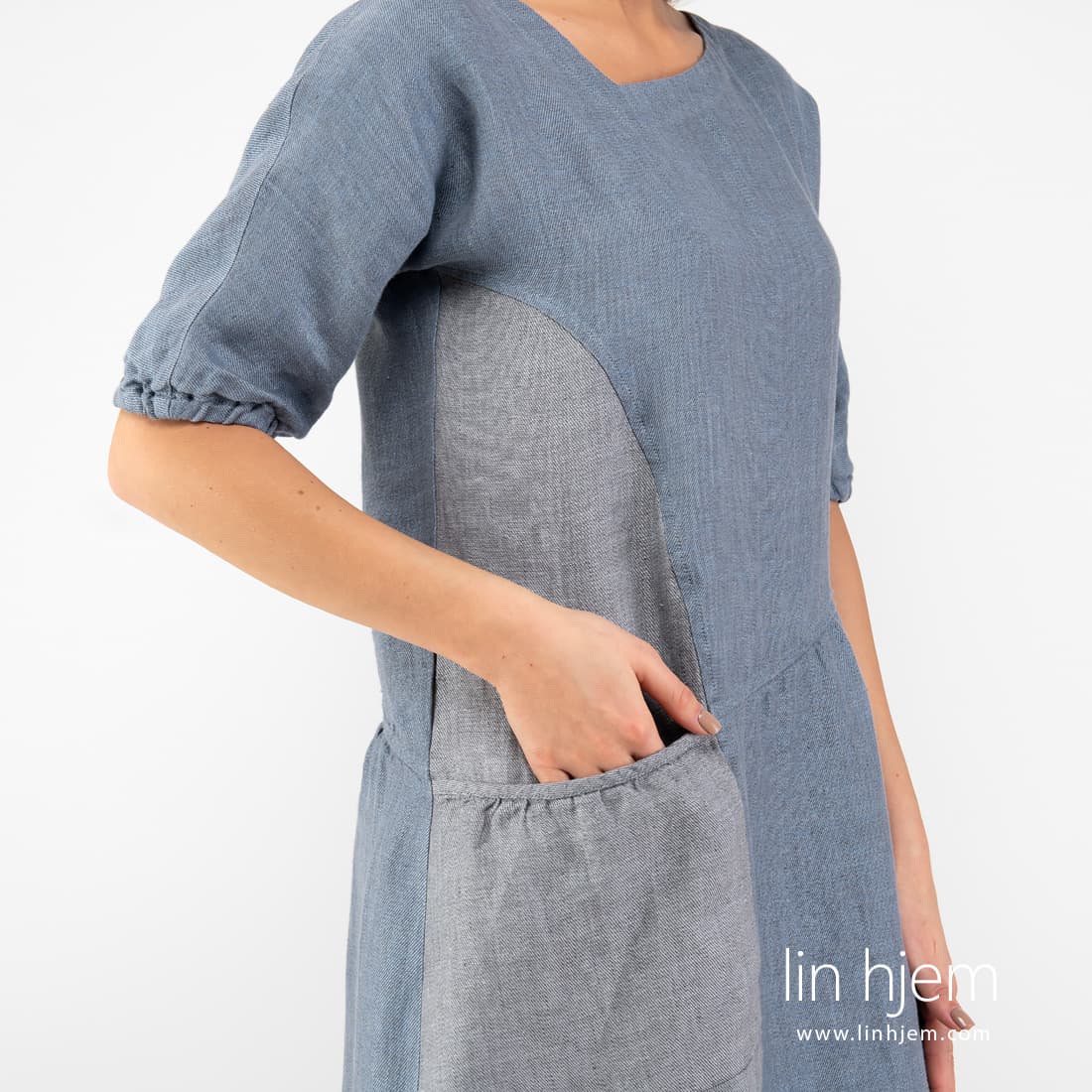 INDI blåaktig kjole laget av tosidig linstoff som er vevd i diagonale striper av grå-brune, blå og blå-grå garn. Komfortabel og stilig kjole til hverdagen!