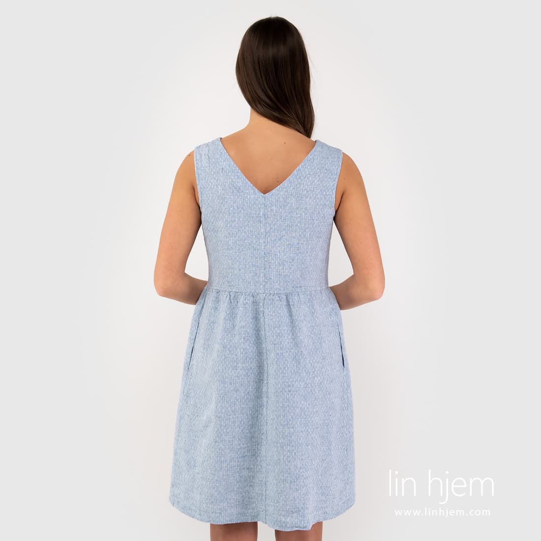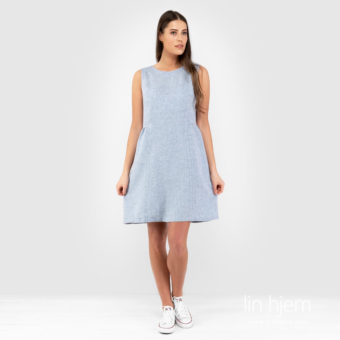 Kort lyseblå linkjole av mønstret stoff. Produktets stoff ble vevd av lyseblå og hvite garn dekorert med små romber. Kort, subtil mønstret kjole som passer til spesielle anledninger og hverdagen. Veldig komfortabel kjole!