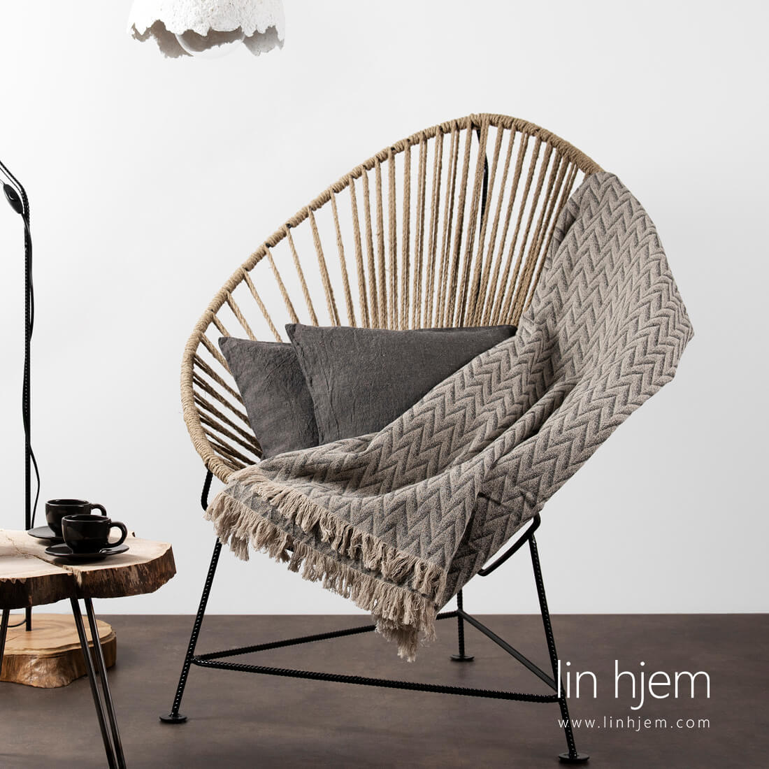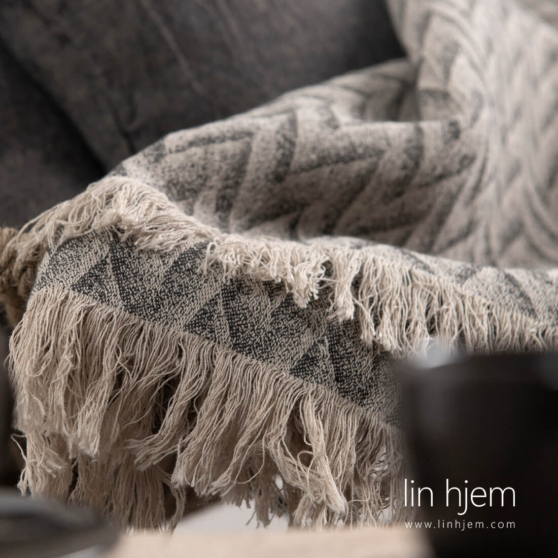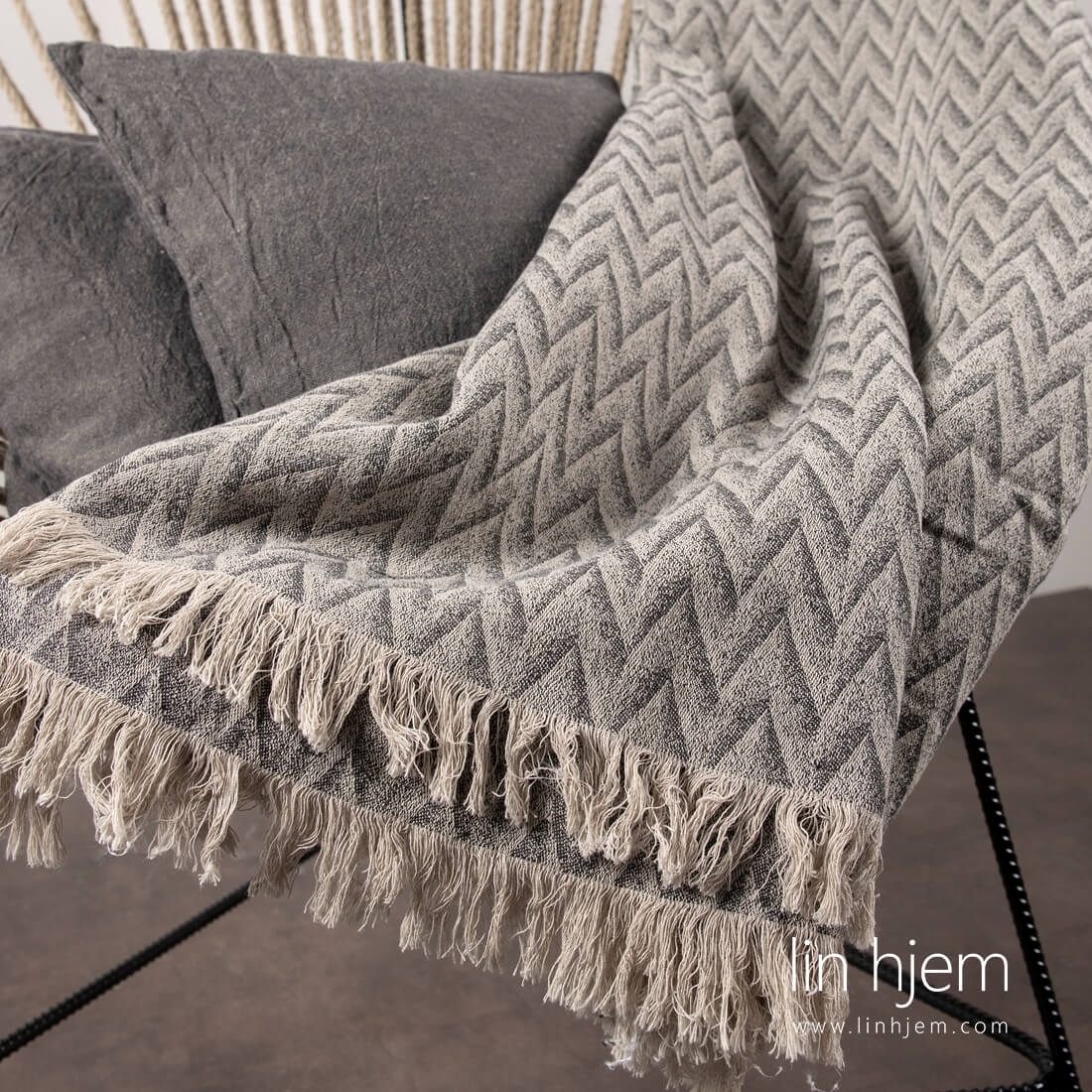 Halvlin pledd med grått sikksakk mønster. Stoffet ble vevd fra brunaktig grå og mørkegrå garn. Pyntet med 5cm frynser på kortsidene. Spesielt vasket stoff er ekstremt mykt, varmt, skånsomt og behagelig mot huden. Dette pleddet kan kombineres med putetrekk av samme stoff.