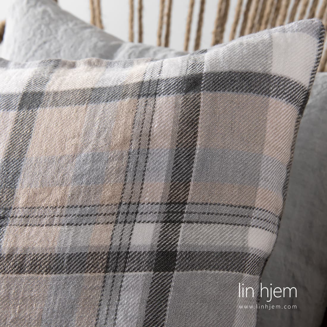 Linputetrekk med grå og kritthvite, brunaktige ruter. Laget med glidelås. Dette putetrekket ble spesielt vasket som blir veldig mykt, skånsomt og krymper ikke. Vi anbefaler å pynte sin sofa, seng med flere enn en pute og matchende pledd i samme stoff.