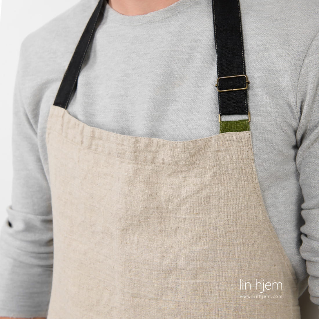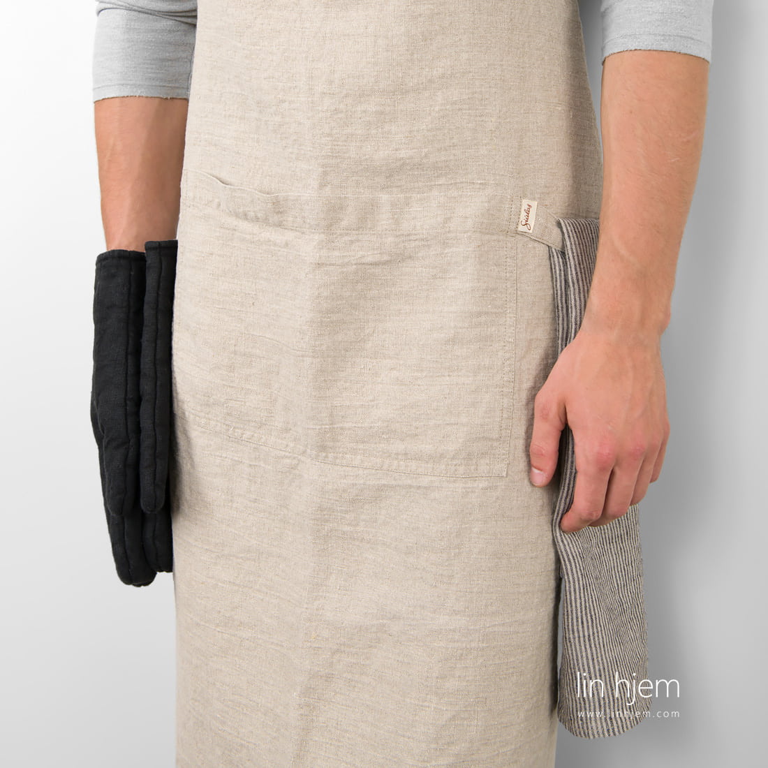 Grått forkle i lin, laget av ufarget naturlig lingarn og holdbart, tettvevd stoff. Stor lomme i front, svart nakkestropp og løkke for håndkle. Produktet ble laget av vasket stoff som gir mykhet og skånsomhet. Sjekk også våre grillvotter i grå, svart og grønn farge som kan passe perfekt til dette forkleet.