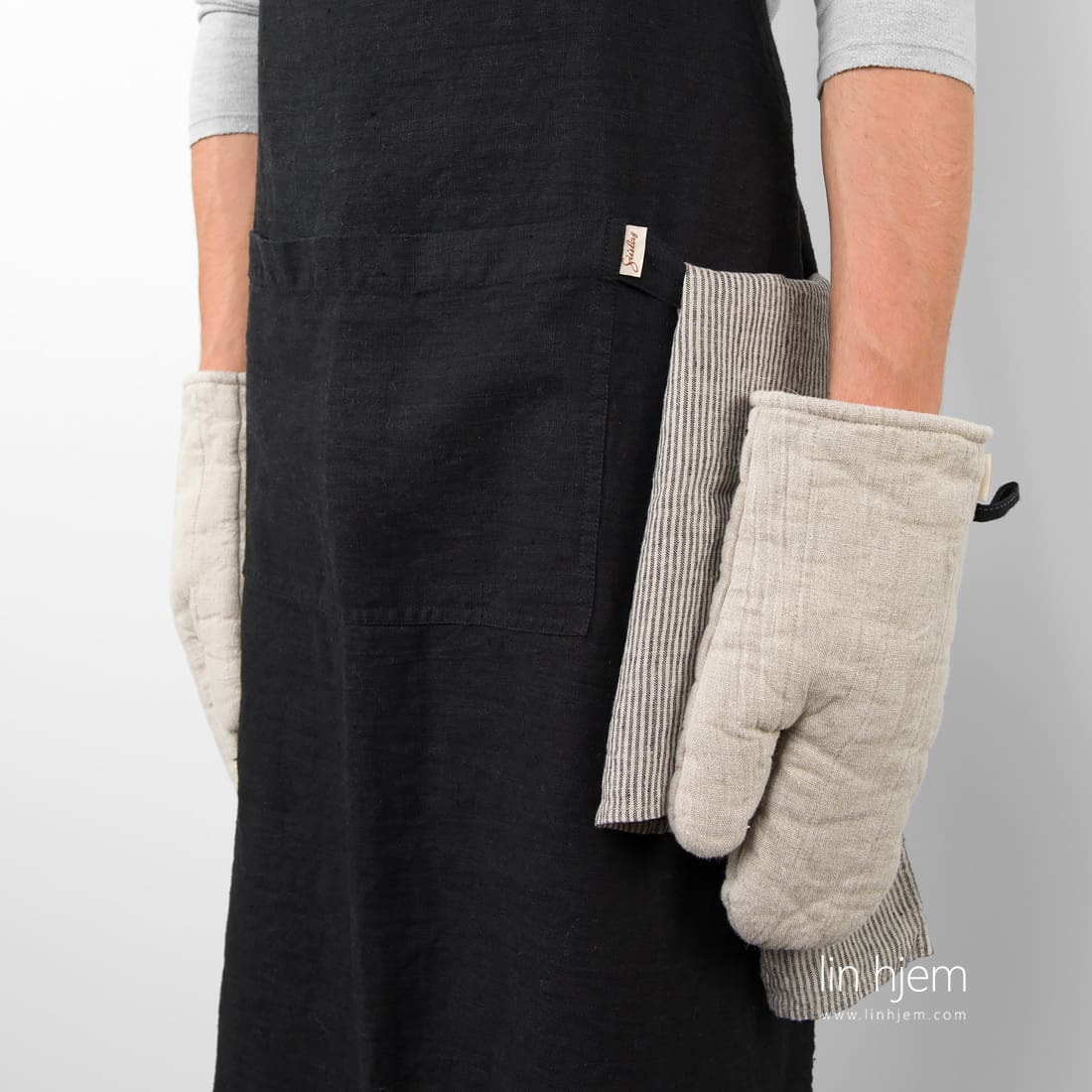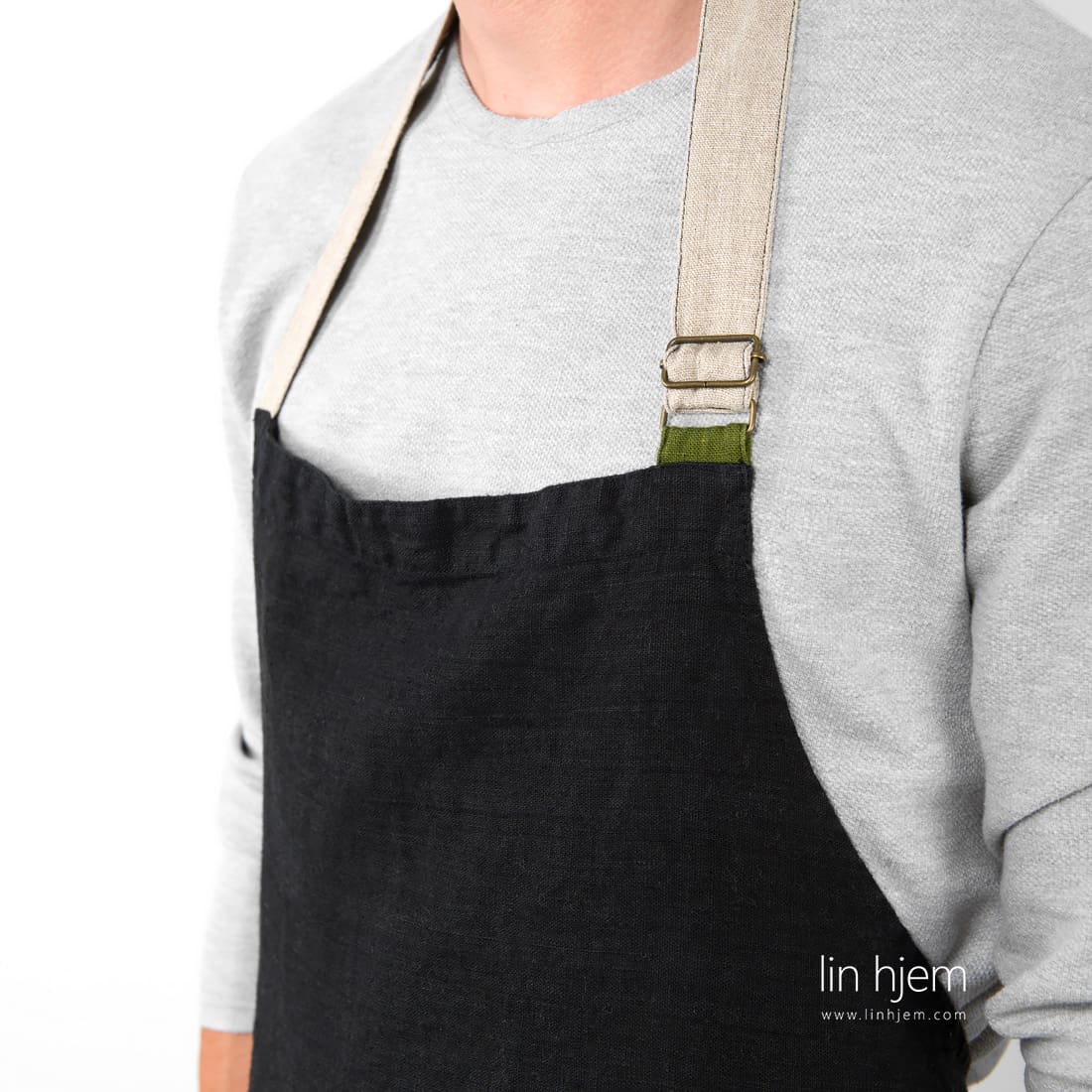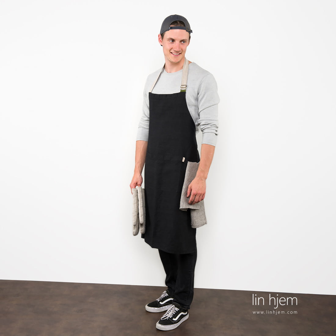 Svart linforkle av mykt vasket 100% linstoff. Forkleet er laget med grå farget belte. Justerbar nakkestropp i grå farge. Stor veldig komfortabel lomme i front. Vi har sydd en stor løkke for å bære håndkle med seg. Ikke tenk på flekker på et svart forkle.