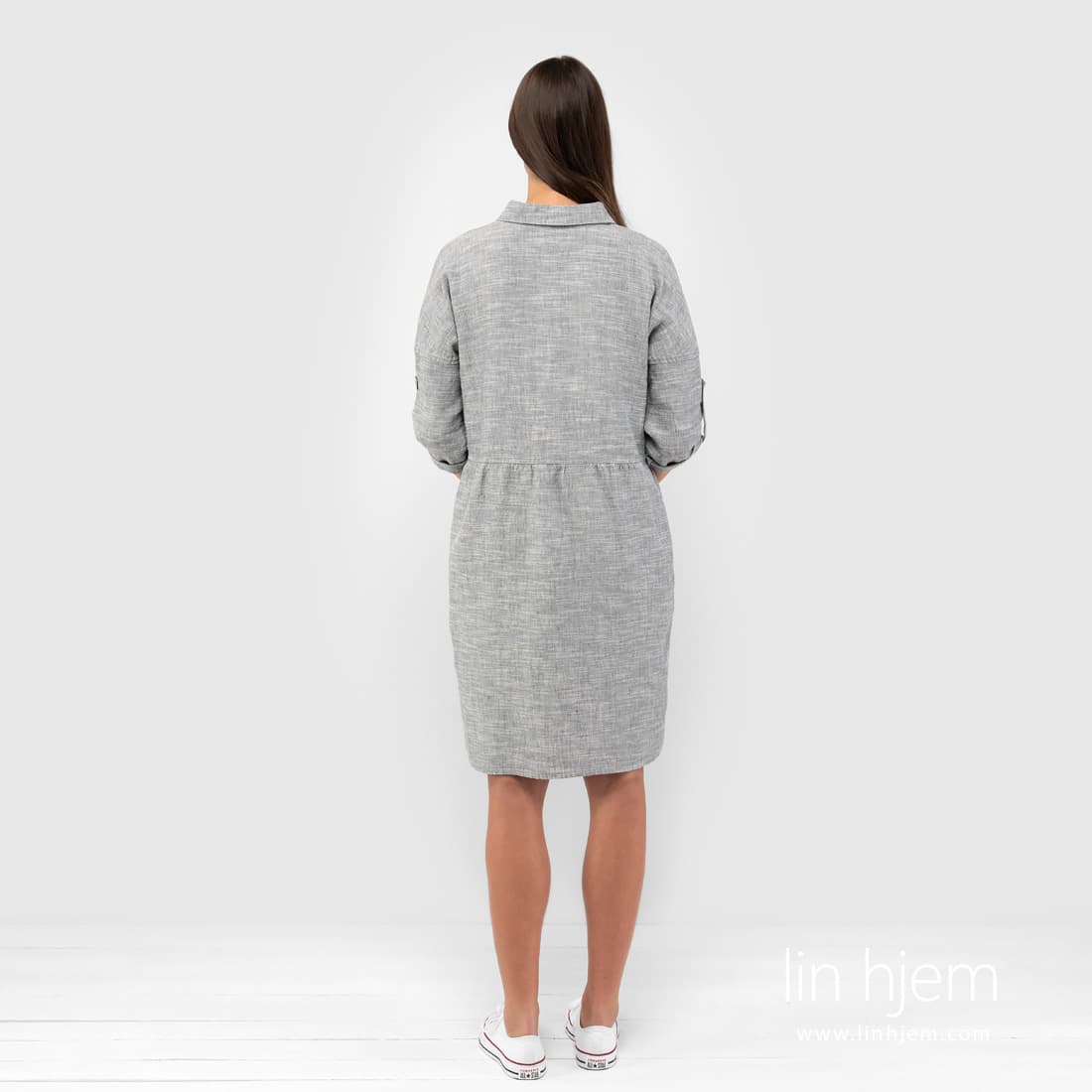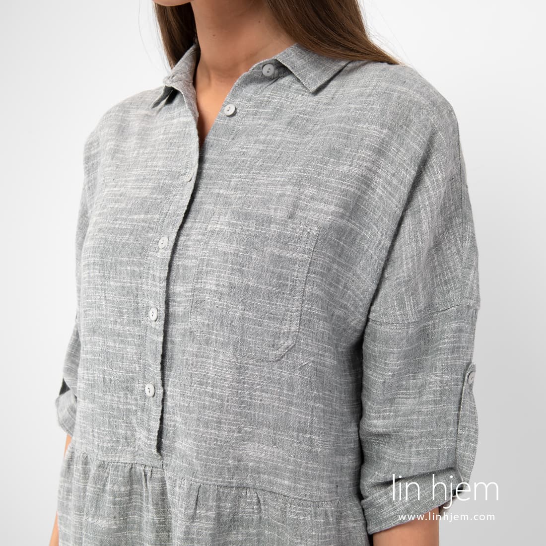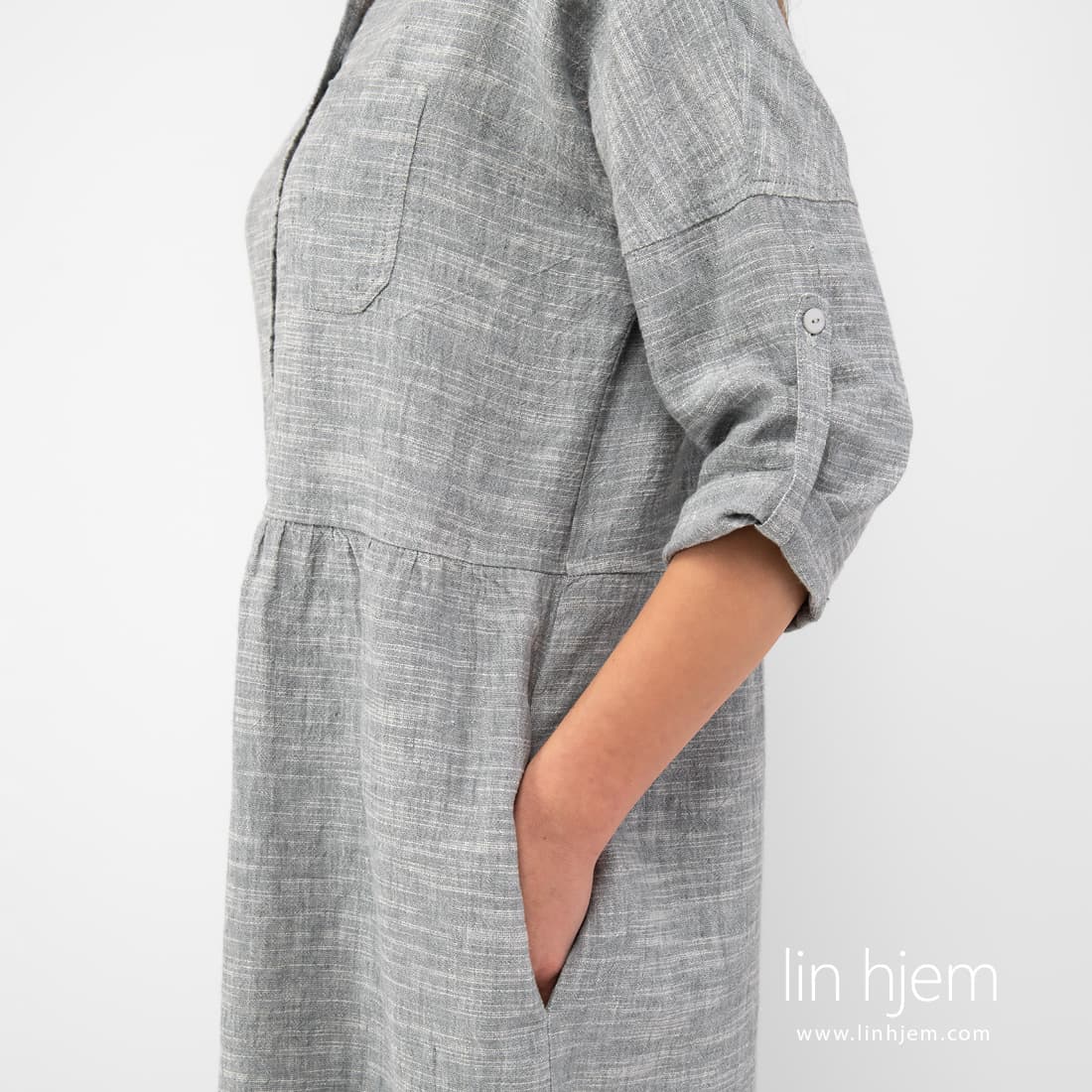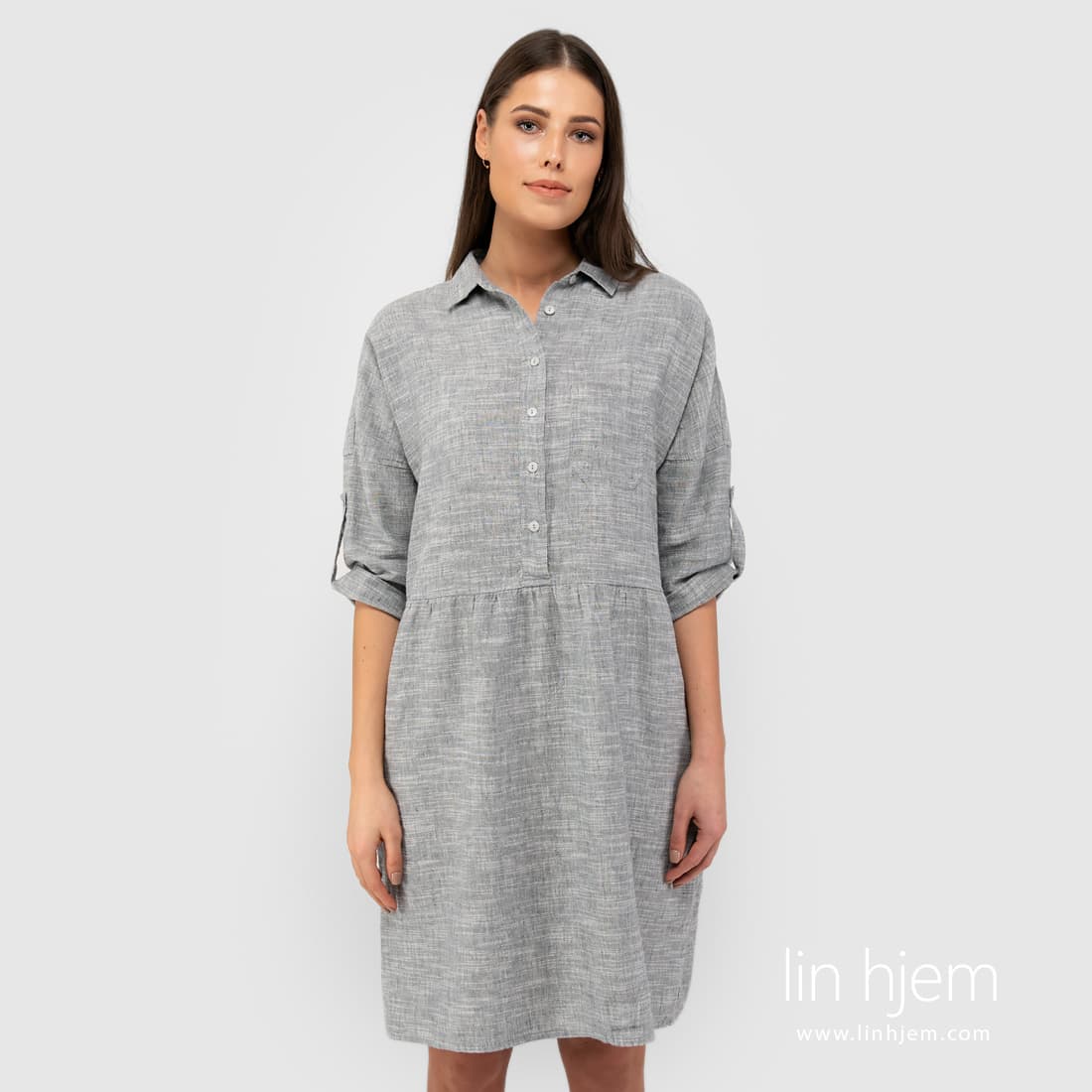 JUDIT grå kjole. Produktets stoff ble vevd av grå og hvite lin-bomulls garn med horisontale hvite striper. Enkel, komfortabel silhuett for hver sommerdag.