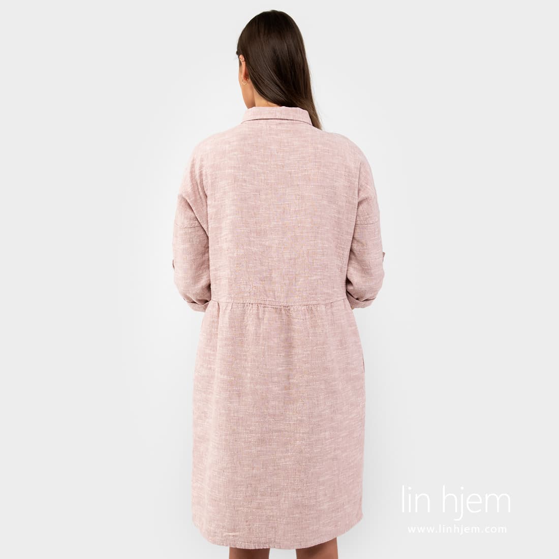 JUDIT kjole laget av melange stoff som ble vevd av melkehvite lingarn og rosa bomulls garn, dekorert med horisontale hvite striper av garn med spesielle fortykninger. Klassisk skjorte design. Denne kjolen er veldig komfortabel, løs og ekstrem myk.