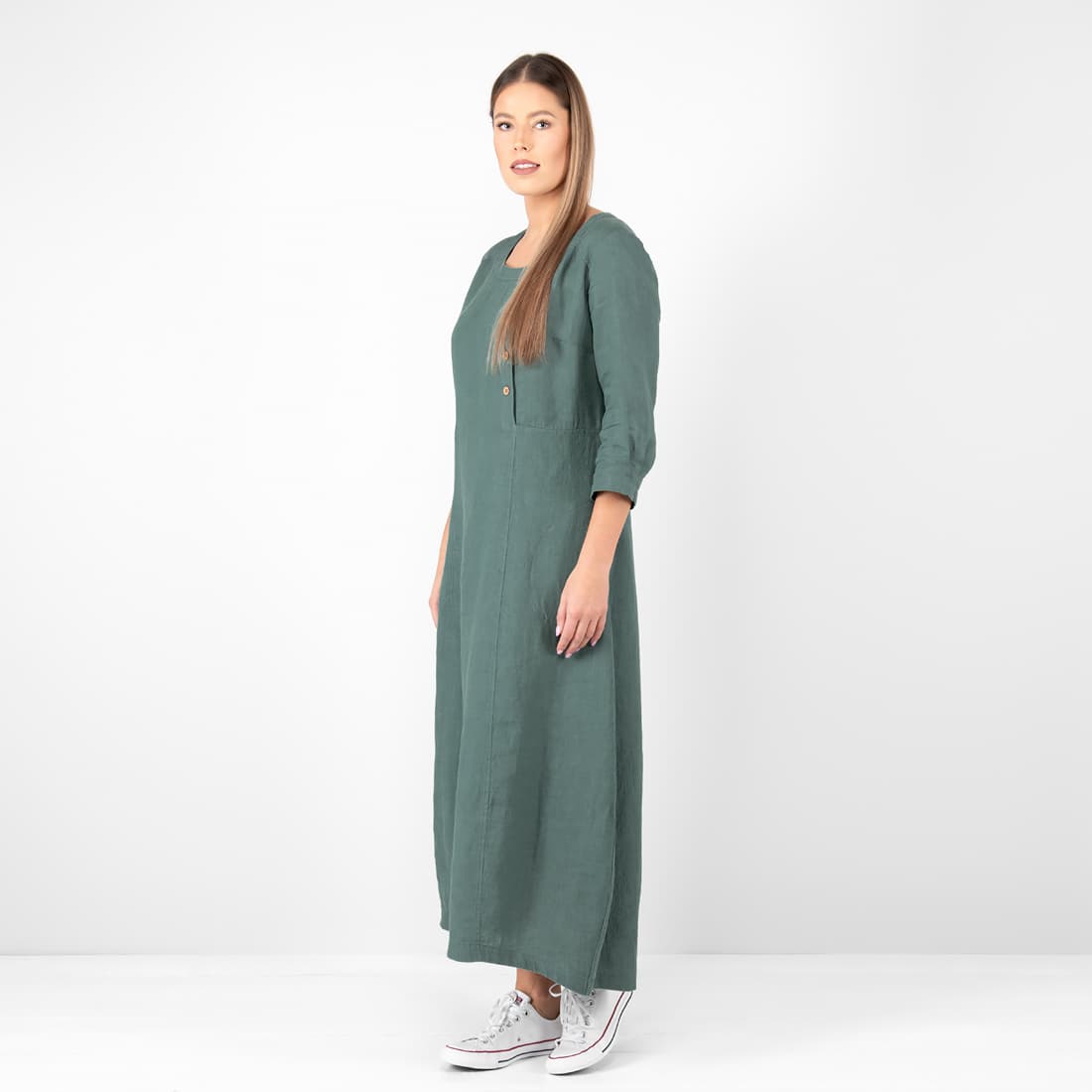 - Detaljer: rund halsutringning, asymmetrisk knappelukking foran, 3/4-ermer med folder, sidelommer
