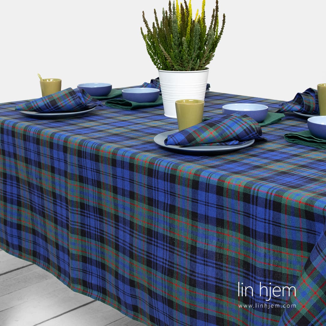 Halvlin duk i grønne, blå ruter og svarte og røde tynne striper. Lin-bomull stoff ble vevd av diagonale striper. Sjekk også våre bordløpere og servietter av samme kolleksjon. Skap koselig atmosfære med denne nydelige duken.