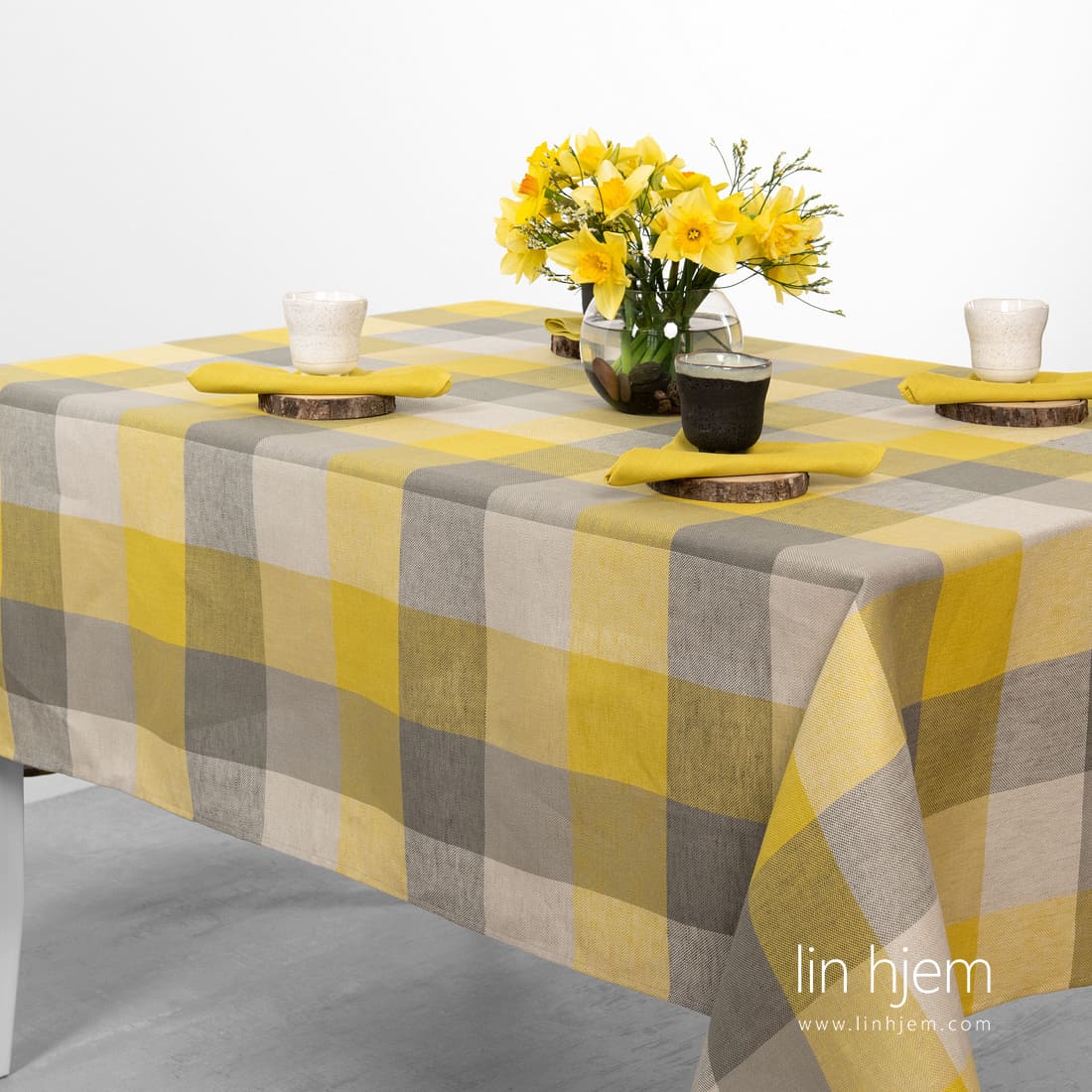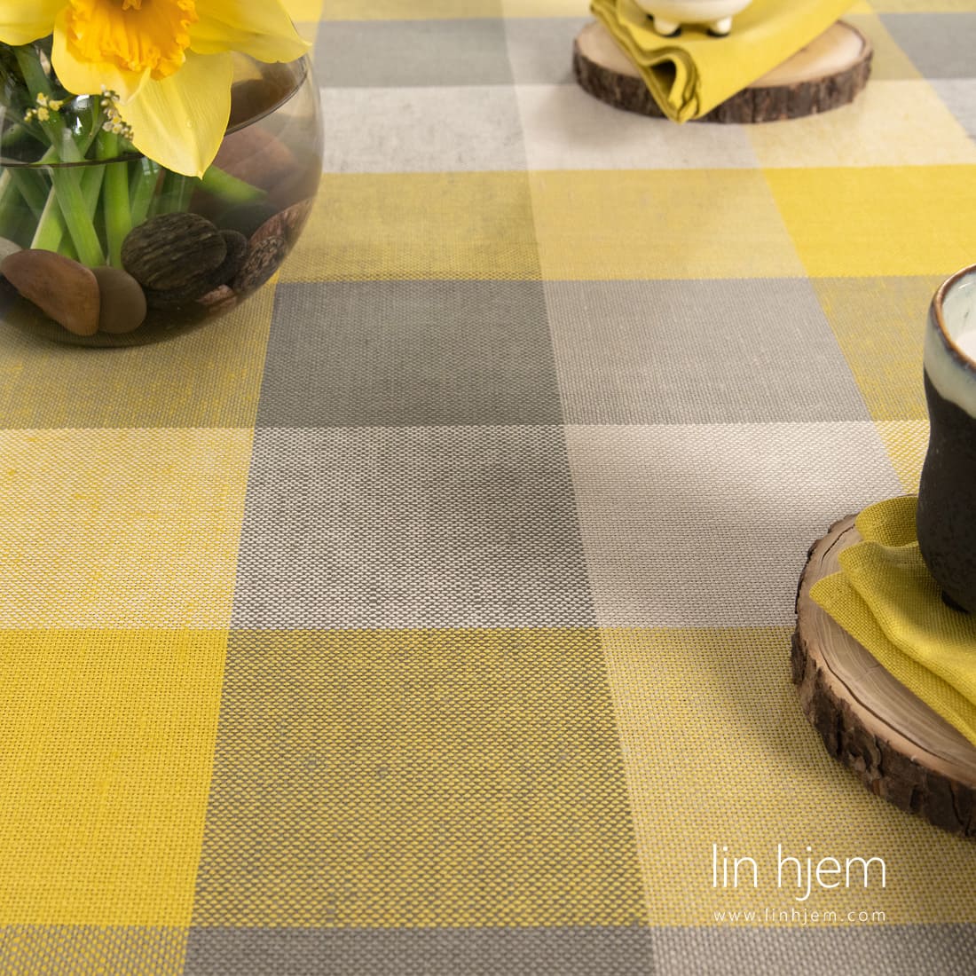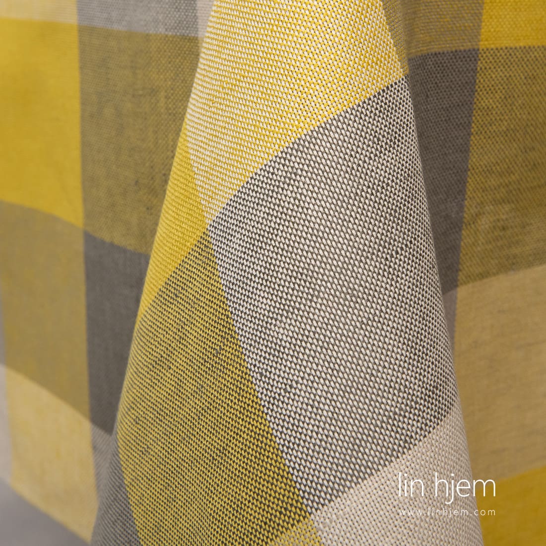 Halvlin gul-grå rutete duk. Produktets stoff vevd i 10cm x 10cm store ruter av hvite, gule, grønngrå og lysegrå lin-bomulls garn. Anbefaler å kombinere med ensfarget gule servietter av samme stoff. Overrask gjestene dine med denne nydelige duken!