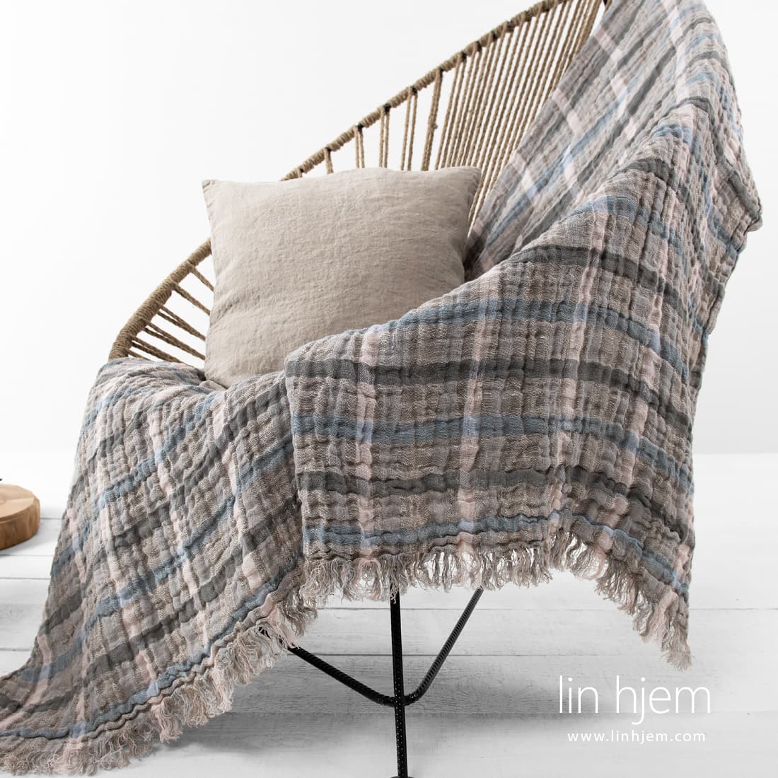 KARRA rutete pledd. Ruter ble vevd av brunaktig grå, blåaktig grå, sand farget, rosa, melkehvite og lyseblå garn. Produktet er spesielt vasket for å gjøre pleddet ekstremt mykt, skånsomt. Kortsidene dekorert med 5cm lange frynser. Subtil pledd av naturlig 100% linstoff. Dekorer soverommet med dette nydelige pleddet.