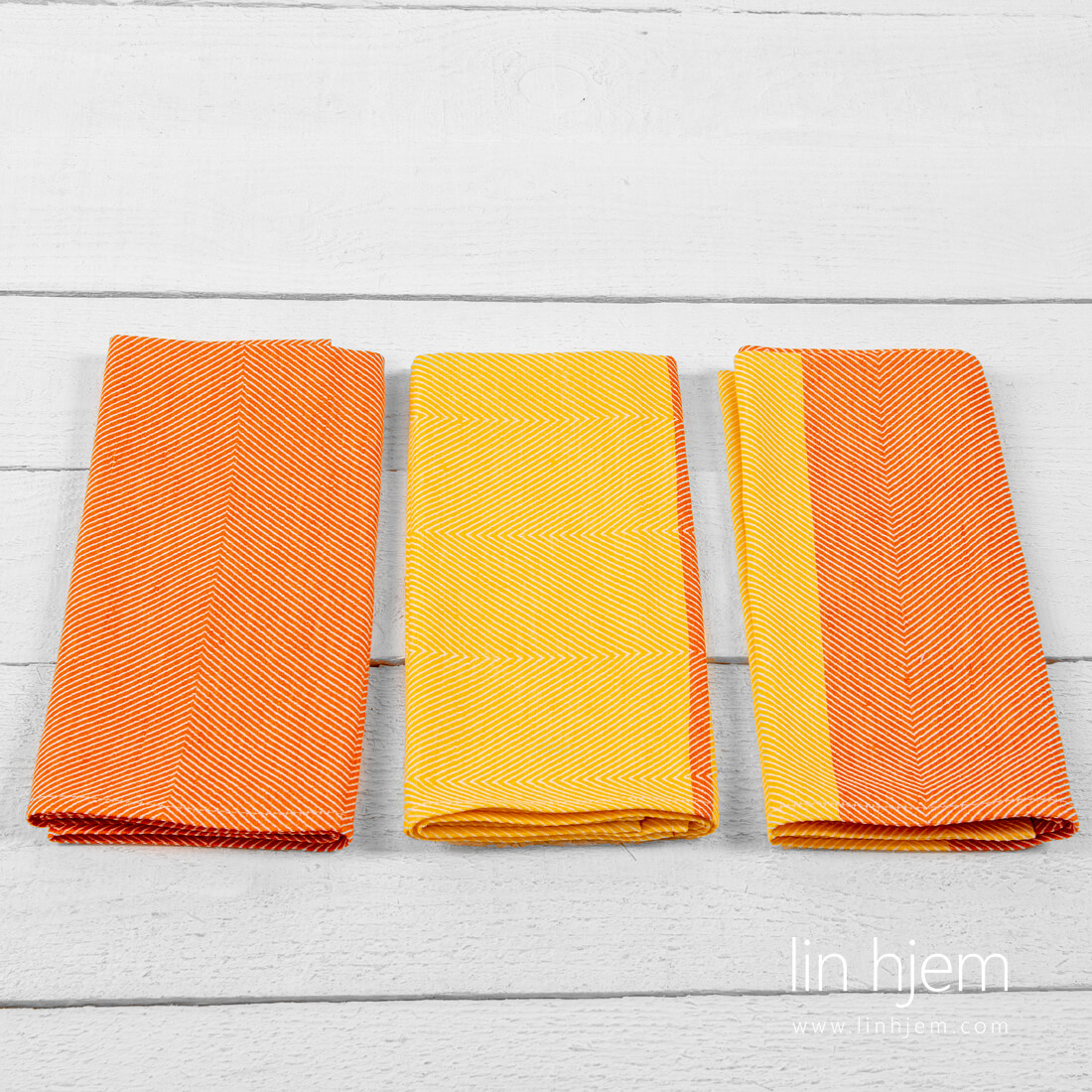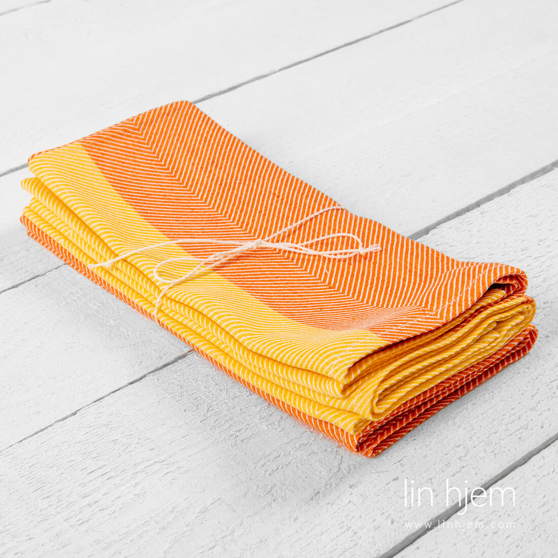 Halvlin oransje kjøkkenhåndklær sett som består av: lin-bomull stoff vevd i "gran" mønster fra hvite, oransje og gule garn. Tettvevd, tøft og holdbart stoff. Dette produktet kan være perfekt gave til familie, venner eller kjente. Koselige, varme farger.