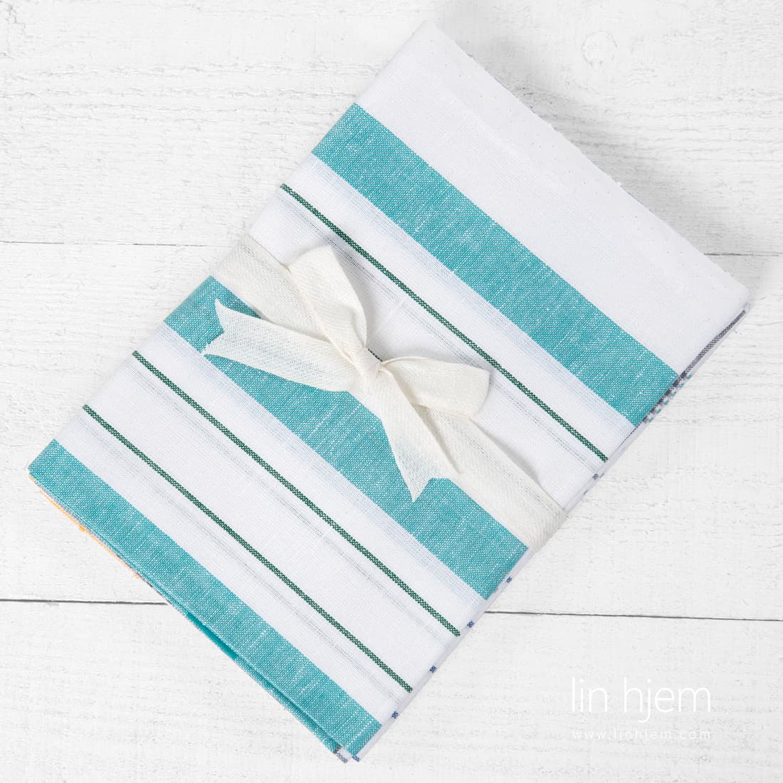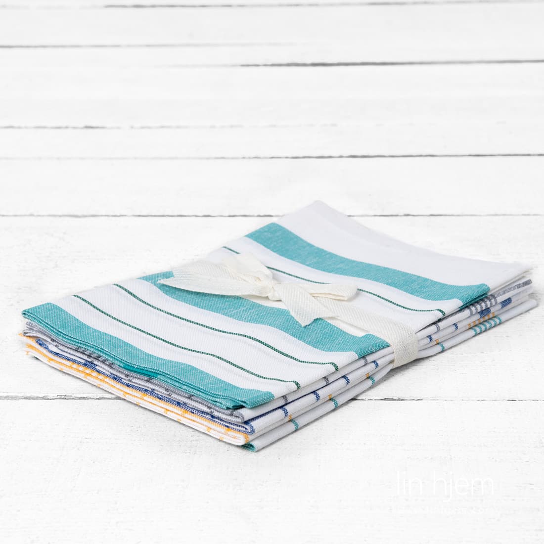 Halvlin kjøkkenhåndklær sett som består av 5 kjøkkenhåndklær, pent bundet med 2cm bred lin stripe. Dette lin-bomulls stoffet er godt absorberende, tettvevd, holdbart, varig.