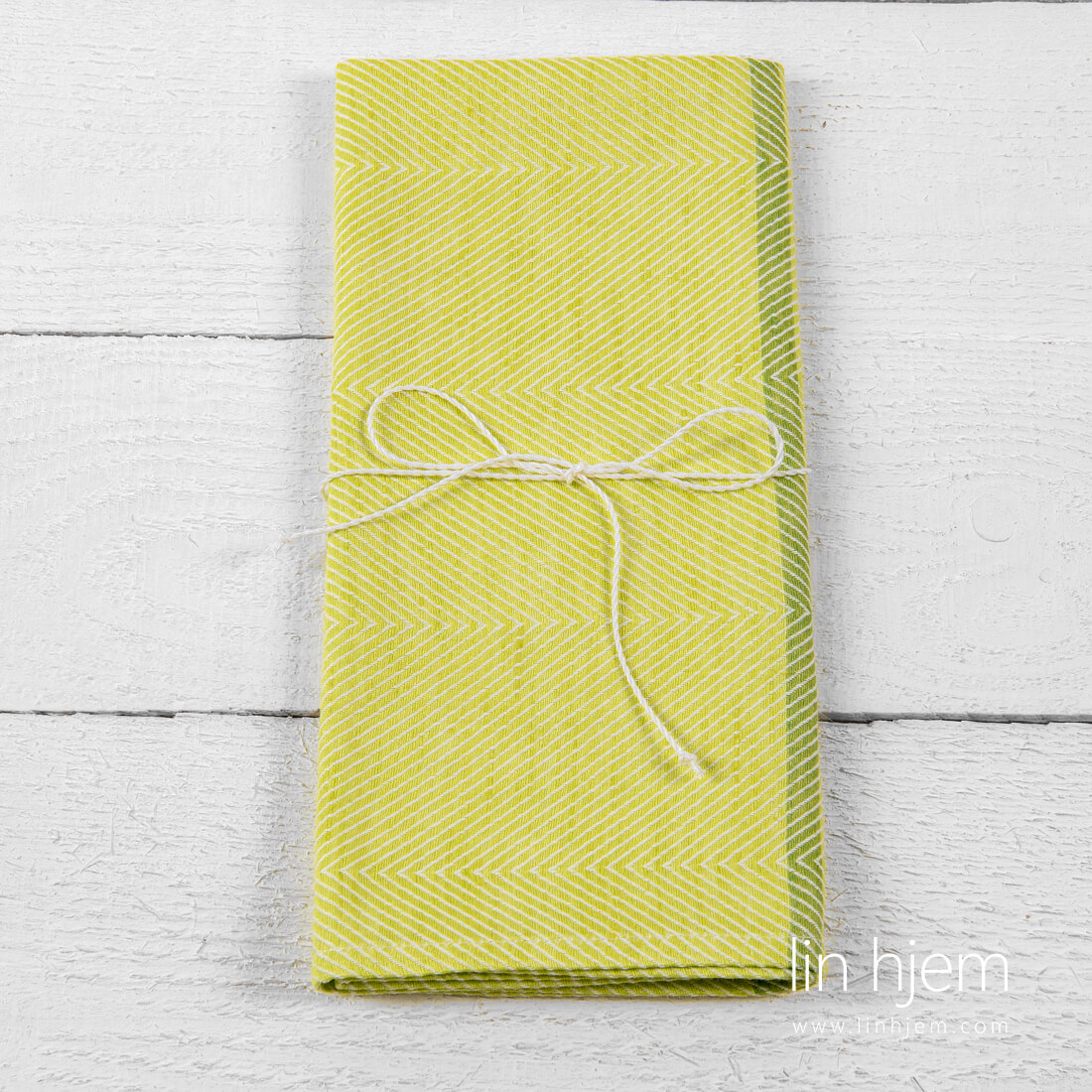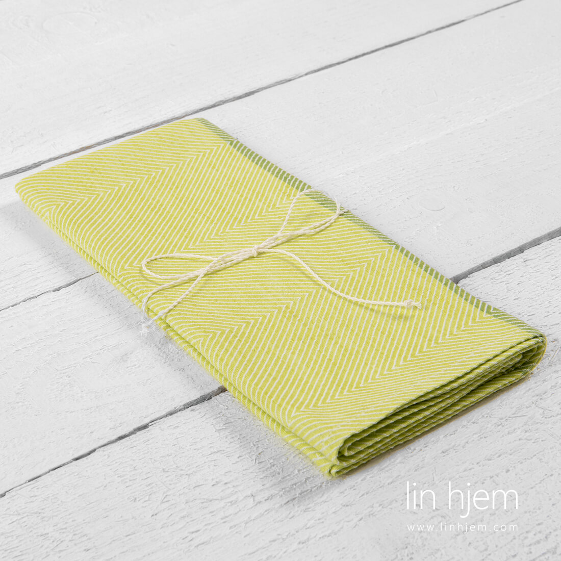 Halvlin kjøkkenhåndkle i lys grønn farge. Tettvevd, holdbart, tøft lin-bomull stoff ble vevd i "gran" mønster av hvite og lysegrønne garn. Absorberer fuktighet veldig godt, tørker fort. Perfekt som en gave.