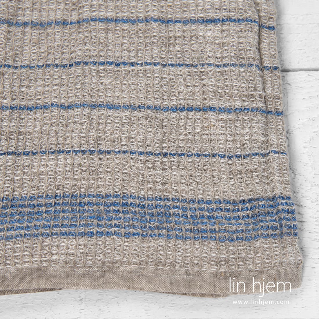 Linkjøkkenhåndkle vevd i "vaffel" ruter og tyne striper av hvite, blå og naturlig(ufarget) garn. Produktets stoff ble spesielt vasket for å gjøre det mykt, skånsomt. Godt absorberende.