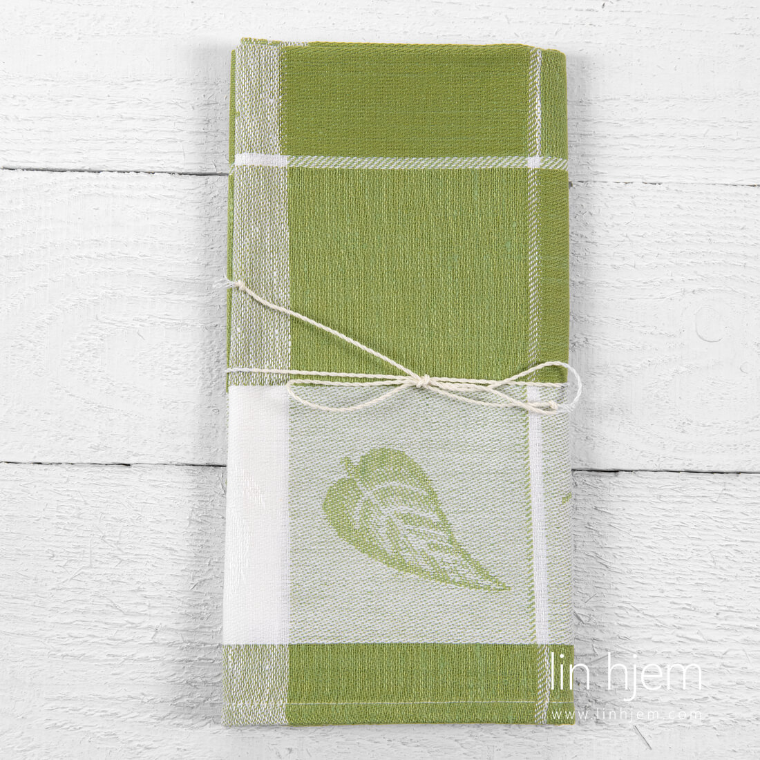 Halvlin kjøkkenhåndkle lysegrønt dekorert store hvite linjer ruter og hvit stripe som er mønstret med grønn pære med blader. Produktet er laget av tettvevd, holdbart og tøft lin-bomull stoff som absorberer fuktighet veldig godt. Dette kjøkkenhåndkleet blir mykere og mykere med hver vask.
