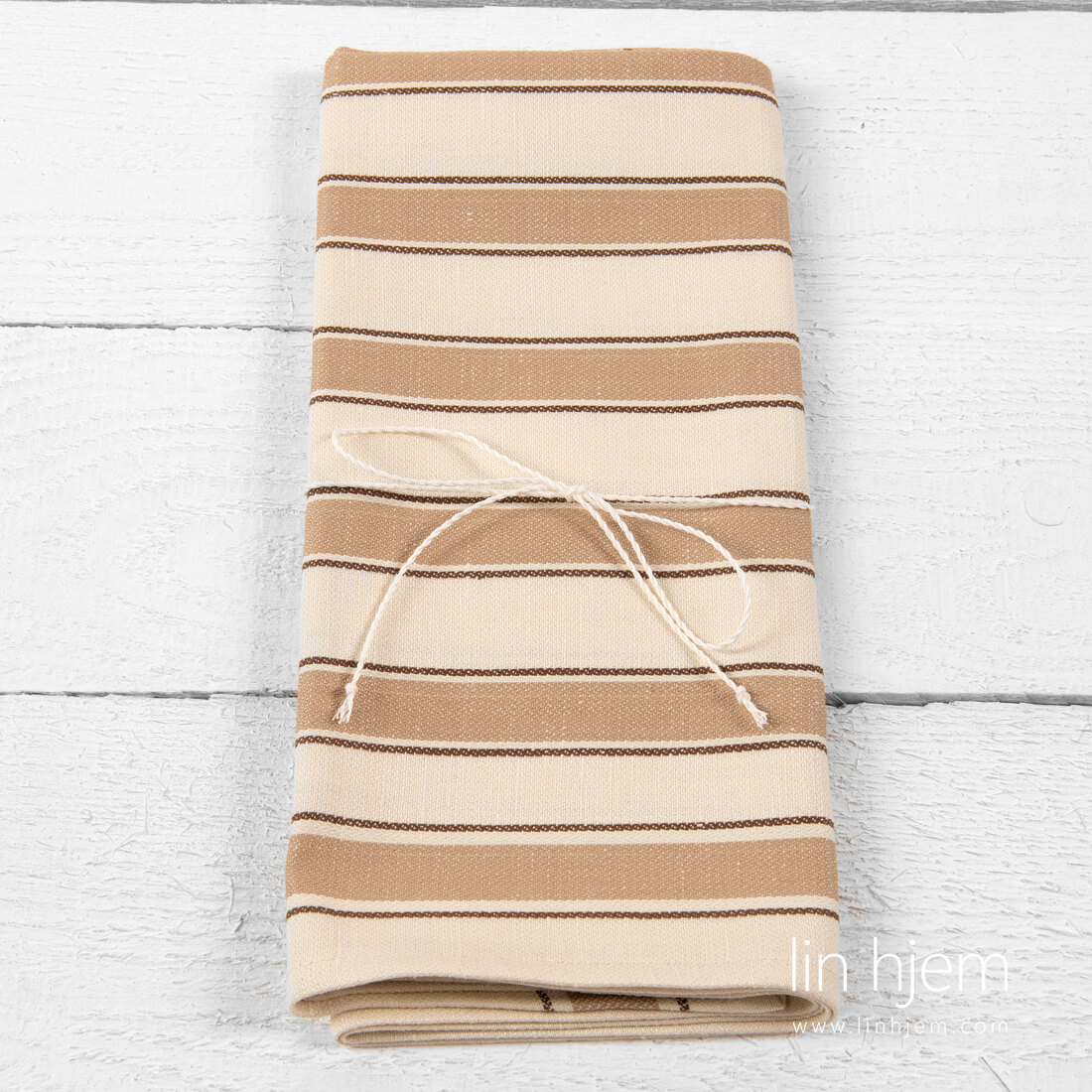 Halvlin kjøkkenhåndkle brunaktig stripete. Produktets lin-bomull stoff ble vevd av gulaktig hvite, mørkebrune og lysebrune garn. Tettvevd, holdbart og tøft stoff som absorberer fuktighet veldig godt og ikke minst tørker fort. Kan være en fin gave til familien, venner og kjente.