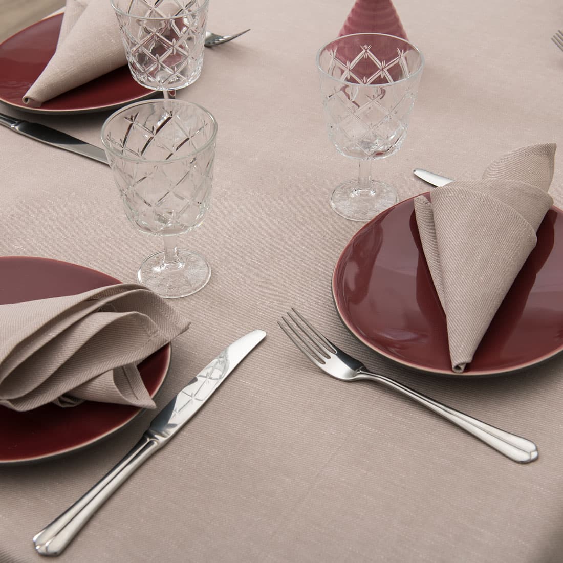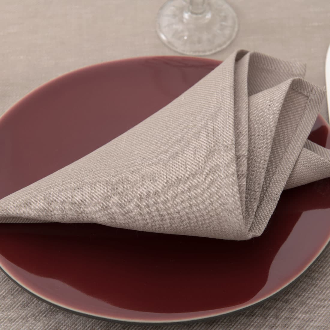 Gråaktig rosa serviett i halvlin er vevd av diagonale gråaktige og rosa striper. Kombiner med duk av samme stoff og farge.